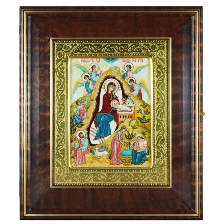Икона "Рождество Христово" в киоте и золотой раме на натуральном перламутре