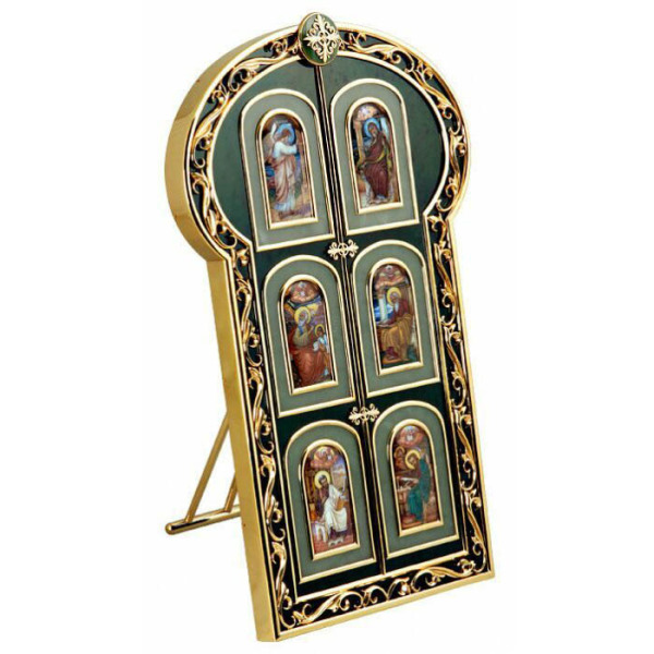 Этот складень — словно врата в вечность, раскрывающиеся перед взором избранных, кому дано прикоснуться к великим тайнам Веры. В строгих очертаниях и тончайшей позолоте сплетаются века преданности и почитания, образы святых словно застыли в мраморной вечности, но живут, как в огненном лике в храме. Лаконичная рама, увенчанная искусной резьбой, обрамляет каждый образ, превращая его в священный портал, где каждая деталь дышит духовностью, возвышая разум и душу.