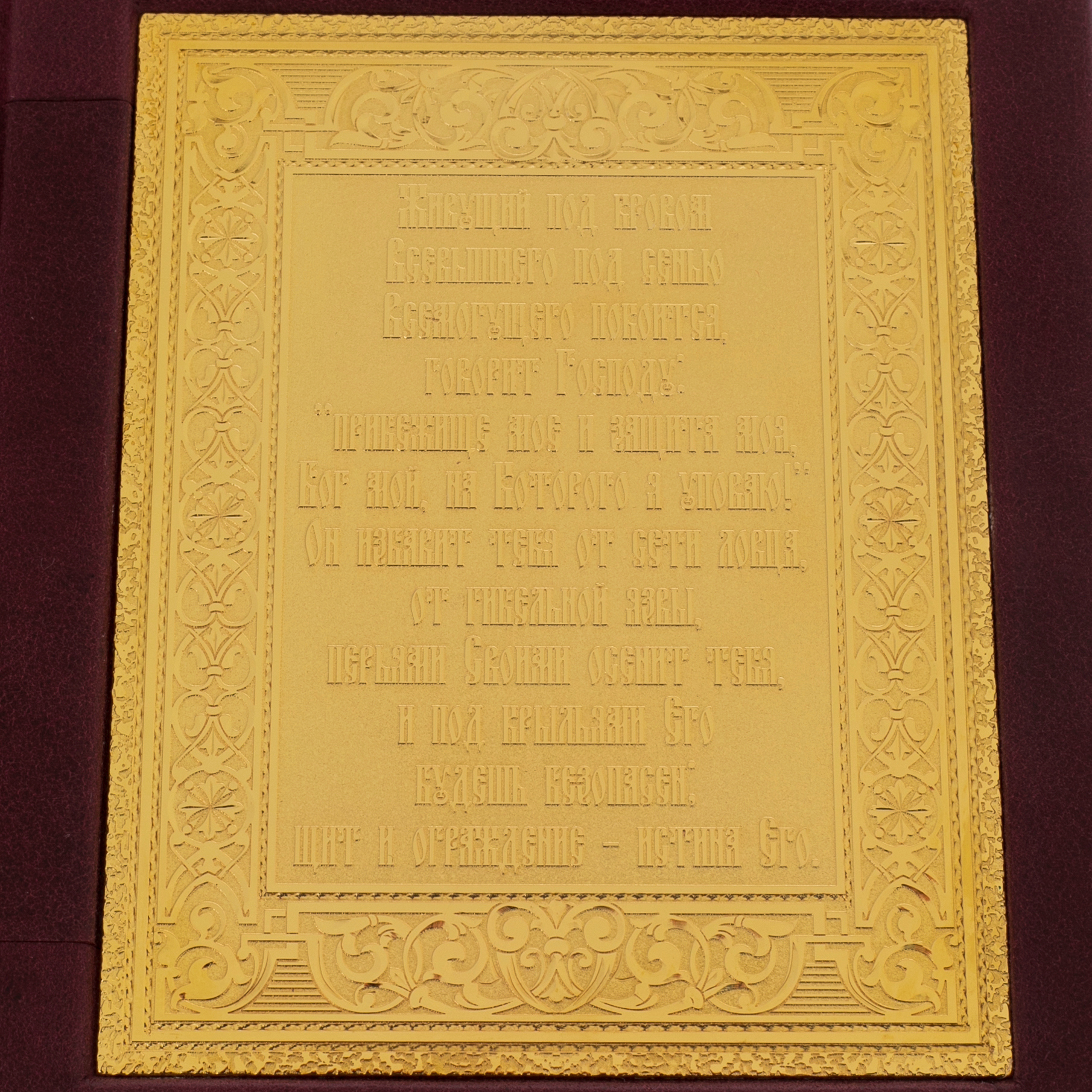На другой стороне складня выгравированы слова молитвы, которая как духовный щит окружает верующего, защищая от всех невзгод. Гравировка — тонкая, изящная работа мастеров Златоуста, излучающая достоинство и мудрость. Когда читаешь эти строки, кажется, что само время замирает, оставляя лишь ясное осознание божественного присутствия и защиты.