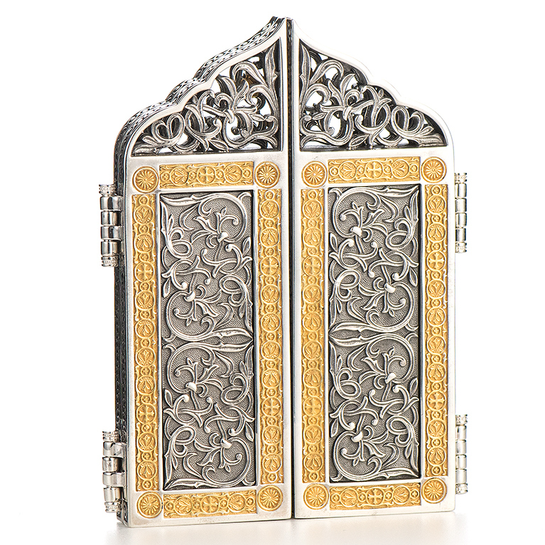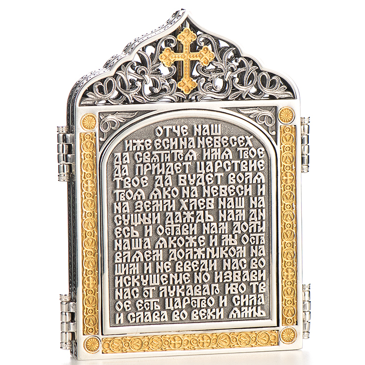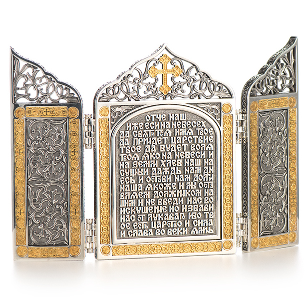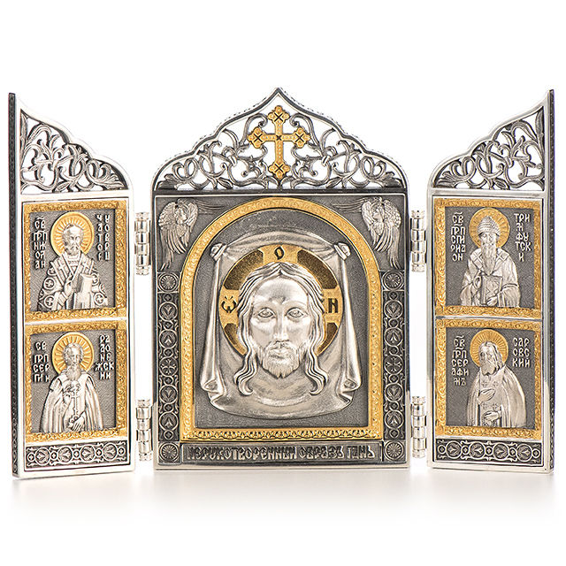 На центральной части трехстворчатого складня воспроизведен знаменитый ушаковский образ Спасителя. Изображение предельно лаконично: плат, на нем лик Христа в нимбе и надпись по-гречески – больше ничего. Симон Ушаков – титан Золотого века, “государев изограф”, совершил революцию в русском иконописании. На смену традиционным приемам, сохранявшимся вплоть до середины XVII столетия, Симон ввел новый художественный язык, построенный на принципах “живоподобия”. На створках запечатлены предстоящие покровители: Святой Николай, Сергий Радонежский, Спиридон Тримифунтский, Серафим Саровский. На обороте триптиха нанесен отрывок из молитвы «Отче наш».