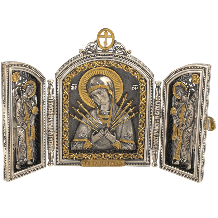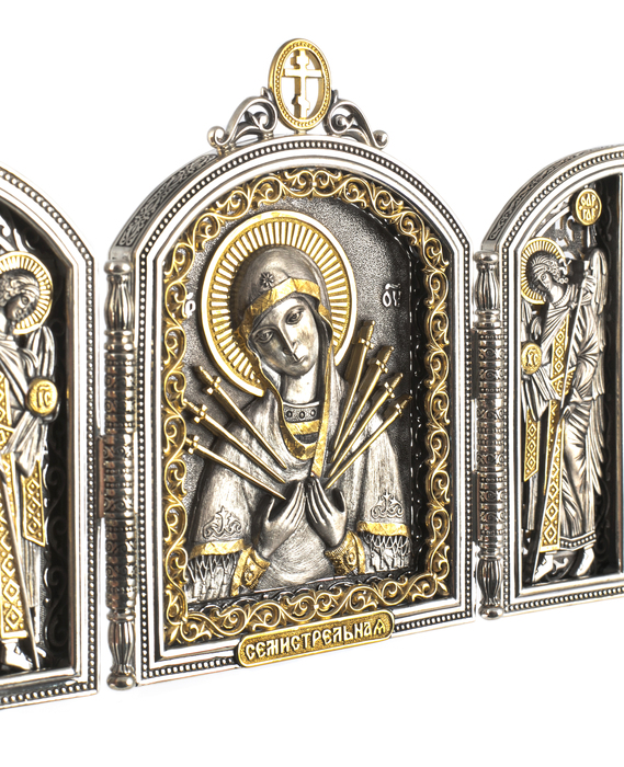 На центральном элементе складня изображена Божья Матерь, которую пронзают семь мечей. Последние символизируют горе и боль, которое испытывала Богородица во время распятия Иисуса. Число семь в христианстве означает полноту или избыток. А в данном случае значение иконы передает бесконечную боль и горечь матери. Некоторые трактуют значение Семистрельной иконы как семь человеческих греховных страстей, которые она способна прочитать в каждом злом сердце. Богоматерь просит каждого искоренить все греховные мысли и готова просить Сына помочь всем молящим в заступничестве. Значение иконы Семистрельной Божьей Матери имеет северорусское происхождение.