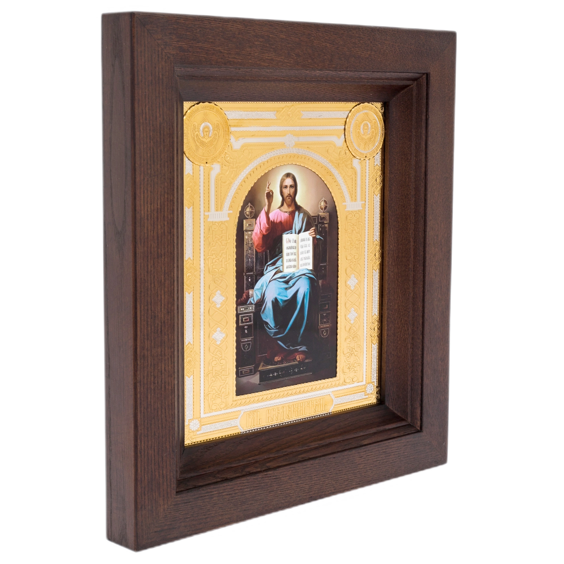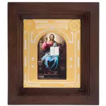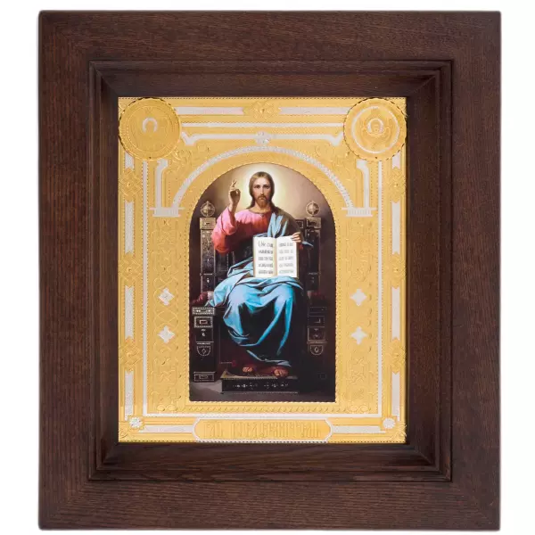 Икона «Господь Вседержитель» в киоте, выполненная мастерами Златоуста, представляет собой канонический образ, воплощающий идею божественной власти, мудрости и всевидящего присутствия. Центральная композиция раскрывает образ Христа, восседающего на престоле, с благословляющим жестом и раскрытым Евангелием, символизирующим истину и духовный закон. Икона заключена в строгий деревянный киот, подчёркивающий её сакральный статус и защищающий образ, придавая всей композиции завершённость и внутреннюю сосредоточенность.