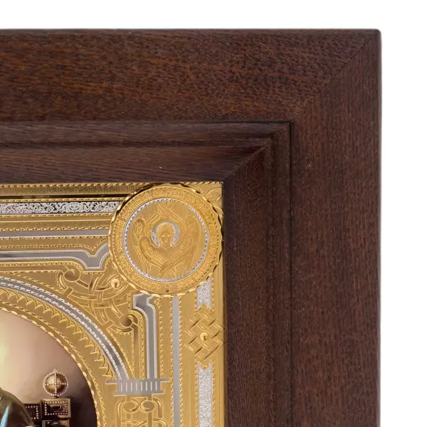 Оформление иконы выполнено с использованием златоустовской техники, включающей гравировку, травление и нанесение позолоты и серебрения, благодаря чему орнаментальный оклад приобретает сложную фактуру и глубину. Рельефные узоры, обрамляющие центральный образ, формируют архитектурную структуру, напоминающую храмовое пространство, усиливая ощущение торжественности. Декоративные элементы, включая медальоны и орнаментальные вставки, выполнены с ювелирной точностью, создавая гармонию между изображением и обрамлением. Контраст тёплого золота и холодных светлых акцентов подчёркивает значимость образа, выделяя его на фоне насыщенной композиции.