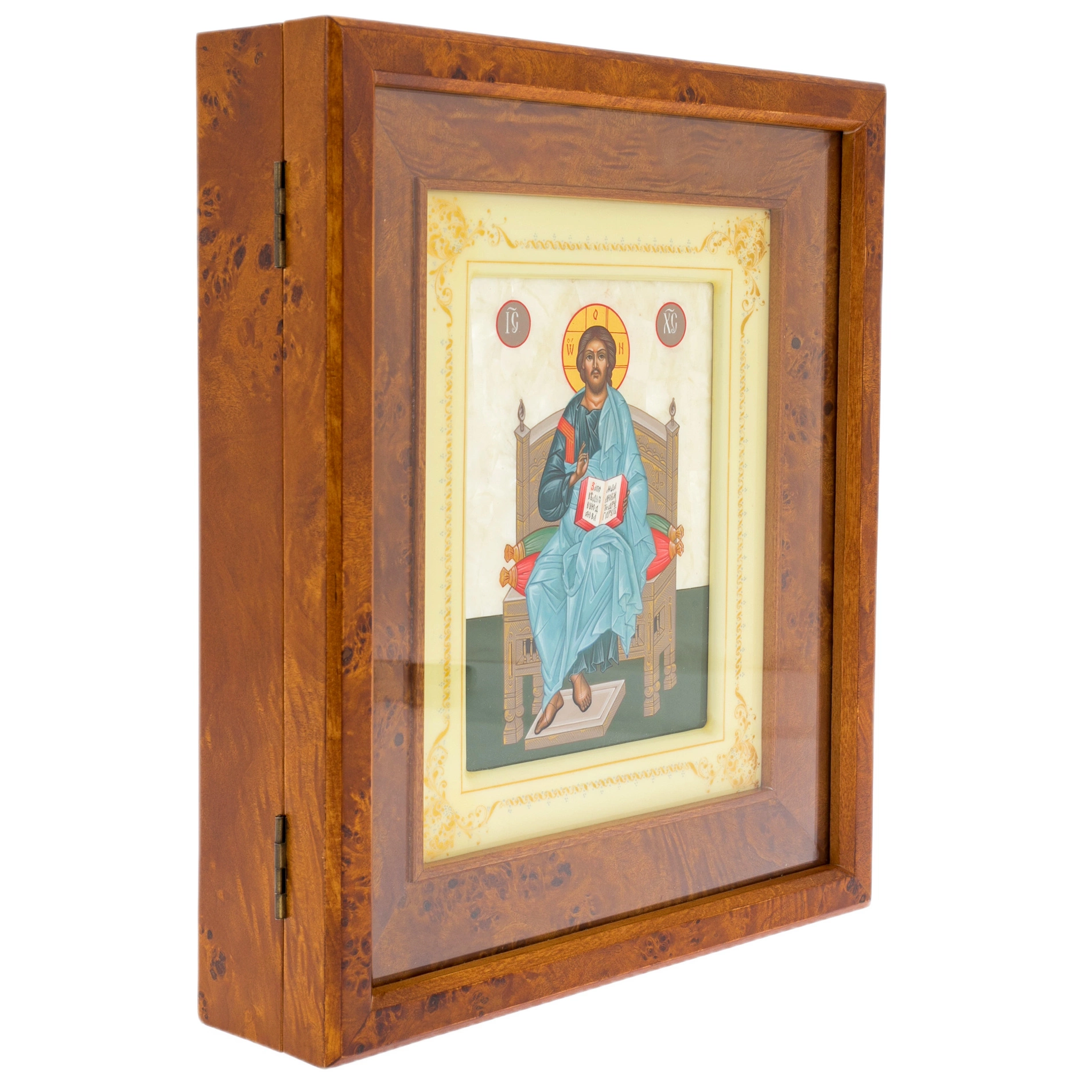 Икона «Спас на престоле», выполненная на натуральном перламутре и заключённая в классический киот, представляет собой канонический образ Христа Вседержителя, исполненный с особой художественной чистотой и внутренней собранностью. Спаситель изображён восседающим на престоле с раскрытым Евангелием, благословляющим жестом обращённым к миру. Композиция отличается строгой симметрией и ясностью линий, благодаря чему взгляд естественно сосредотачивается на лице и жесте, несущих основной смысл. Перламутровая основа придаёт изображению мягкое, живое сияние, усиливая ощущение глубины и духовного присутствия.