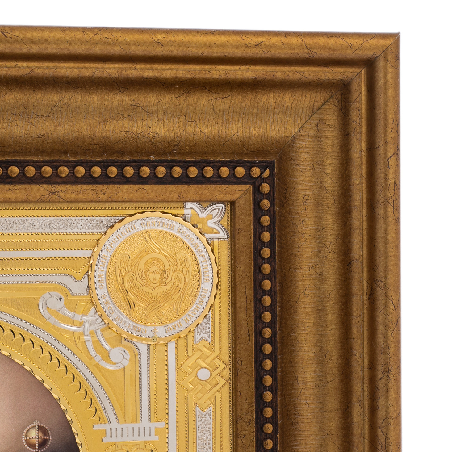 Златоустовская техника, применённая в оформлении иконы, представляет собой искусство филигранной гравировки и золочения, передающее тончайшие детали и орнаментальные мотивы с максимальной точностью. Мастера используют многоступенчатую работу с металлом, добиваясь эффекта глубины и благородного сияния, что подчёркивает духовное и художественное значение изображения. Такое оформление придаёт иконе исключительную ценность и уникальность, сохраняя вековые традиции российского ремесла.