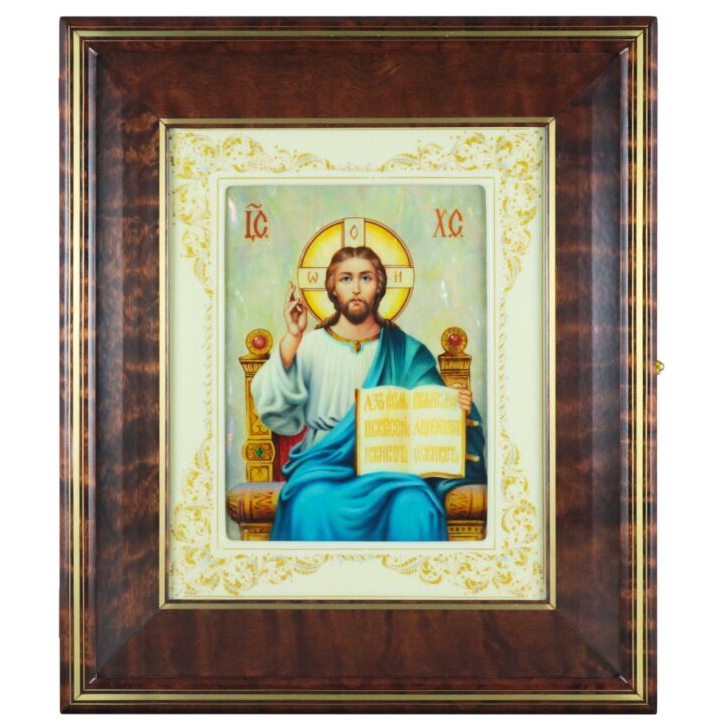 Икона "Спас на престоле" в белой раме и киоте на натуральном перламутре