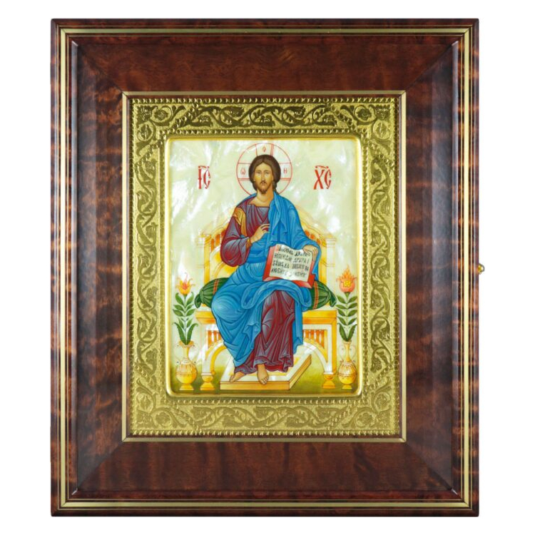 Икона "Спас на престоле" в киоте и золотой раме на натуральном перламутре