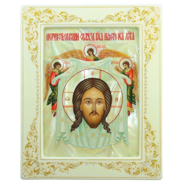 Икона "Спас Нерукотворный" с перламутром в белой раме