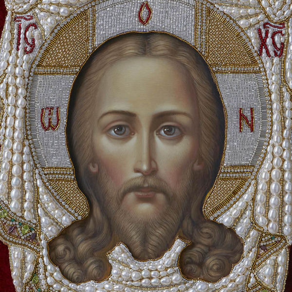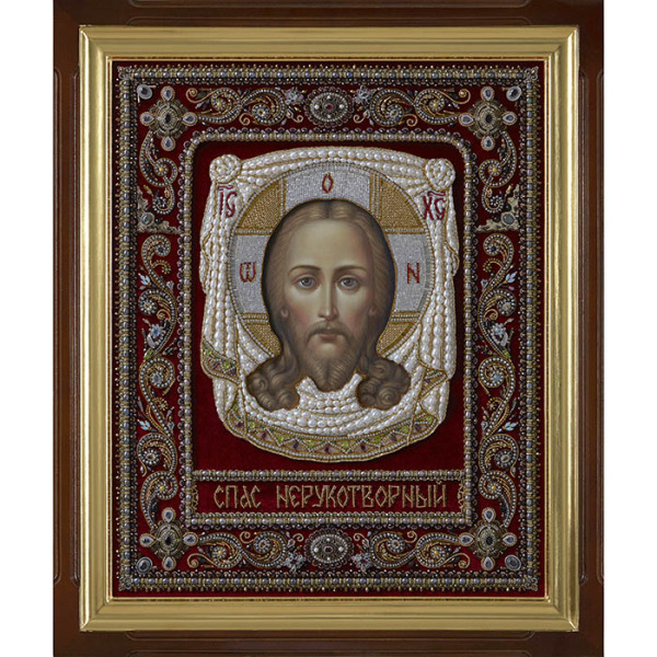 Икона "Спас Нерукотворный" в киоте на натуральном перламутреИкона "Спас Нерукотворный" в киоте на натуральном перламутреОбраз Христа, запечатленный на иконе Спас Нерукотворный, появился благодаря чуду. По Преданию, Иисус, чтобы помочь страждущему излечиться от болезни, вытер лик полотном и передал его с посланником. На поверхности отобразилось лицо Спасителя, а возникшая таким образом икона стала исцеляющей для многих верующих. Церковь бережно хранит Спас Нерукотворный как свидетельство вышней силы Христа и символ спасительной веры в Бога. Образ является уникальным прижизненным изображением Иисуса, и ставится в один ряд с Животворящим Крестом и Господним Распятием. На иконе изображается только лик с нимбом, что символизирует главенство души над телом.