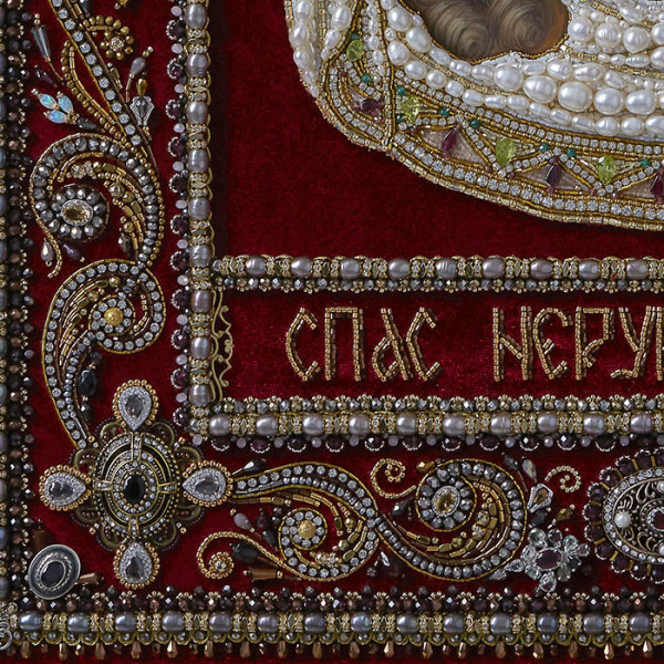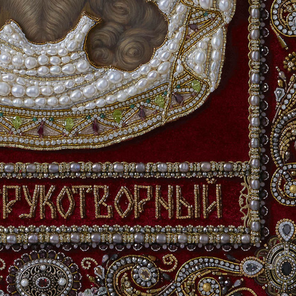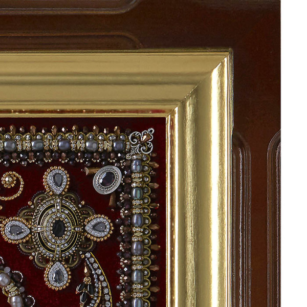 Обрамление иконы — это симфония мастерства, где каждое прикосновение иглы и каждого стежка является актом творчества. Орнаментальное шитьё, созданное вручную, оживает в переливах цитрина, граната, хризолита, кварца, циркона и жемчуга. Эти материалы словно заключают в себе дыхание природы и энергию земли, превращаясь в символ чистоты, мудрости и вечной гармонии. Извивающиеся узоры бисероплетения создают ритм, напоминающий о непрерывном движении звёздных сфер, а тончайшая золотая нить, словно солнечные лучи, оживляет бархатную текстуру фона, придавая ей глубину и объём.