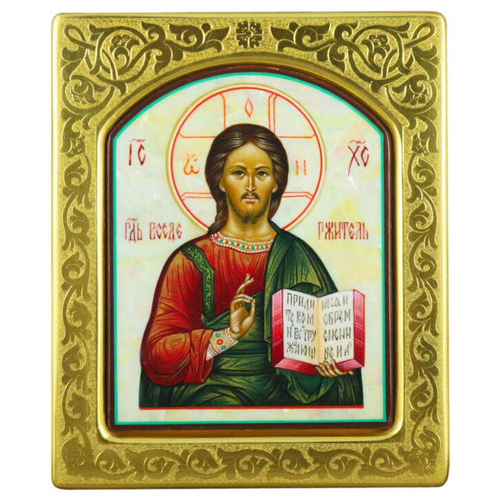 Икона с перламутром "Спаситель" в золотой раме с чеканкой