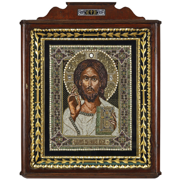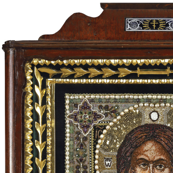 Вышитая икона "Господь Вседержитель" в антикварной раме и киоте