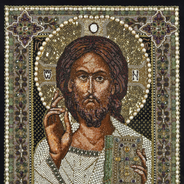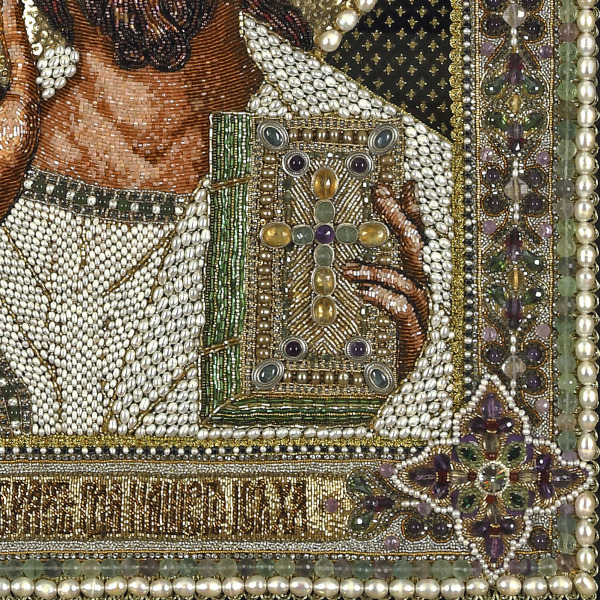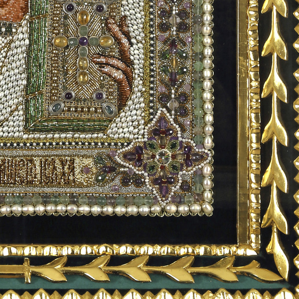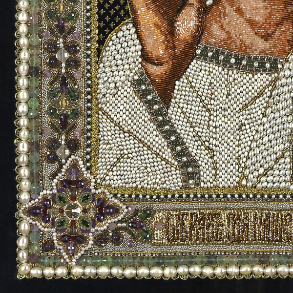 Эта икона выполнена в технике лицевого шитья, где каждый элемент создан с филигранной точностью. Перламутровые жемчужины, искристый кварц, насыщенные оттенки аметиста и изумруда формируют сложный орнамент, отражающий божественную гармонию. Драгоценные материалы — хрусталь, сапфир, гранат, а также золотная нить и качественный чешский бисер — придают иконе роскошь и благородство. Каждый камень аккуратно вплетён в ткань образа, создавая игру света, которая усиливает ощущение присутствия Высшего.