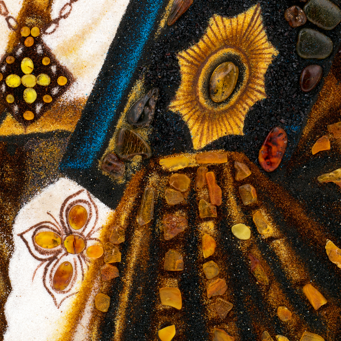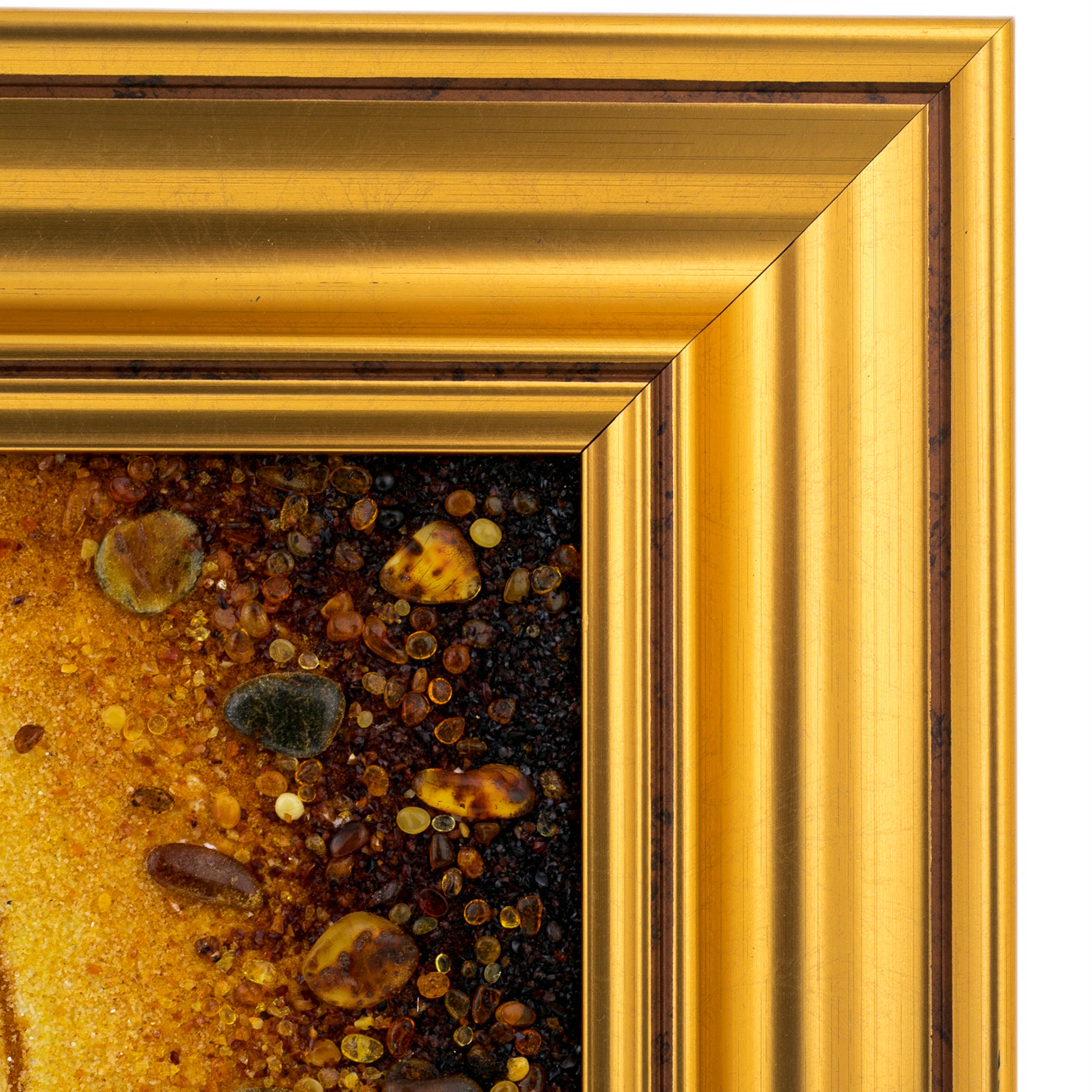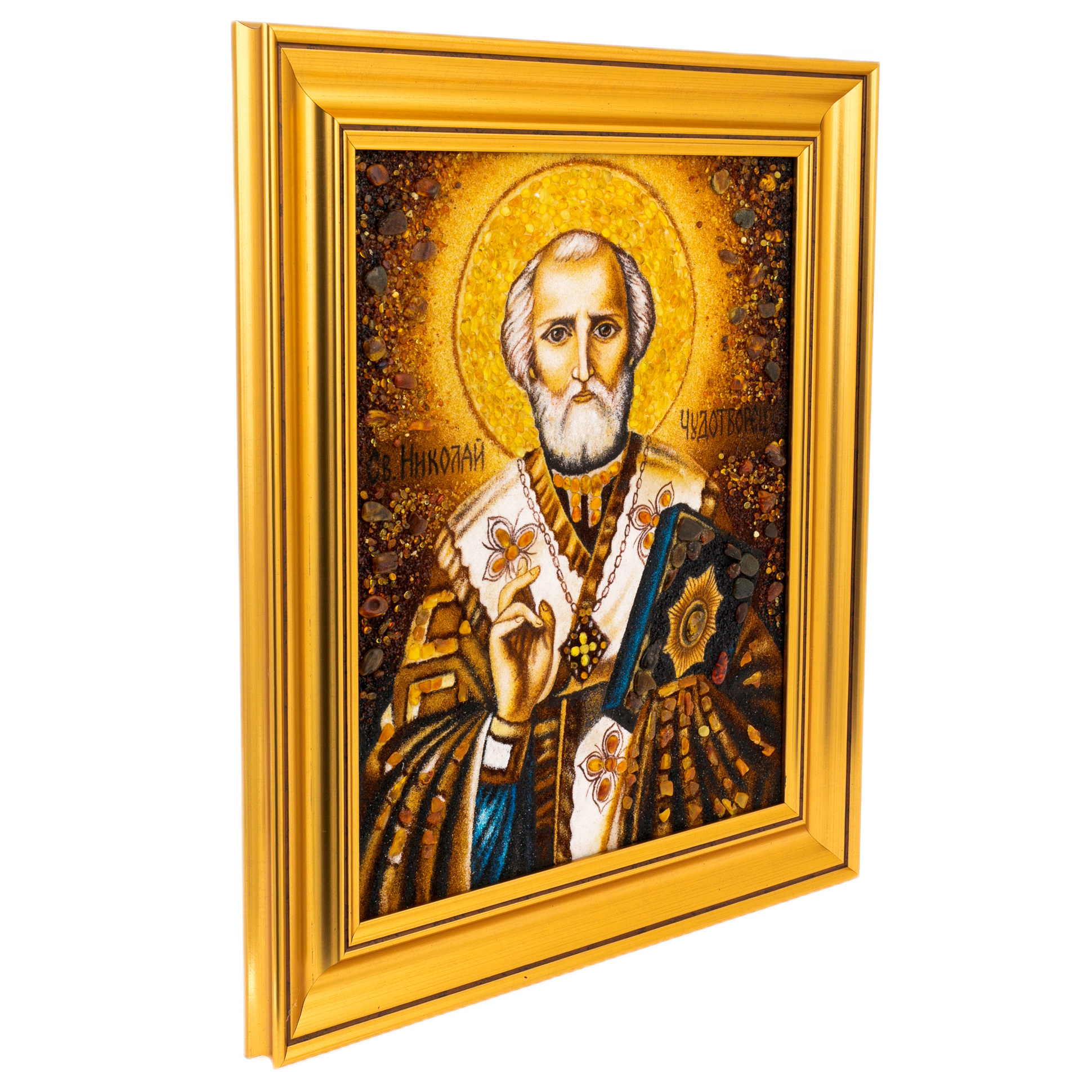 Каждая деталь выполнена с исключительной тщательностью: мягкое мерцание ореола, золотистое сияние риз, глубина глаз — всё передаёт присутствие святого, будто он смотрит сквозь время, благословляя верующего. Разнообразие оттенков янтаря создаёт игру света, меняющуюся при каждом движении — от тёплого золота до густого коричневого, словно сама природа участвует в создании этой святыни. В золотом обрамлении, лаконичном и торжественном, образ приобретает завершённость, напоминая храмовый алтарь, где царит вечный покой.
