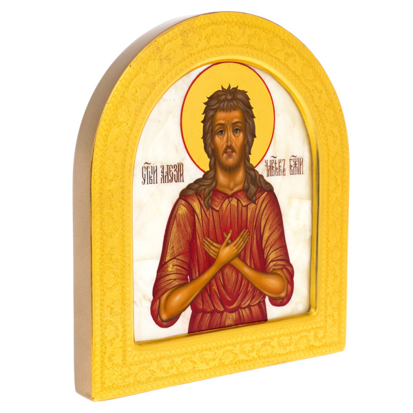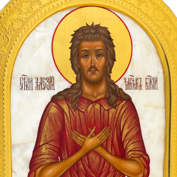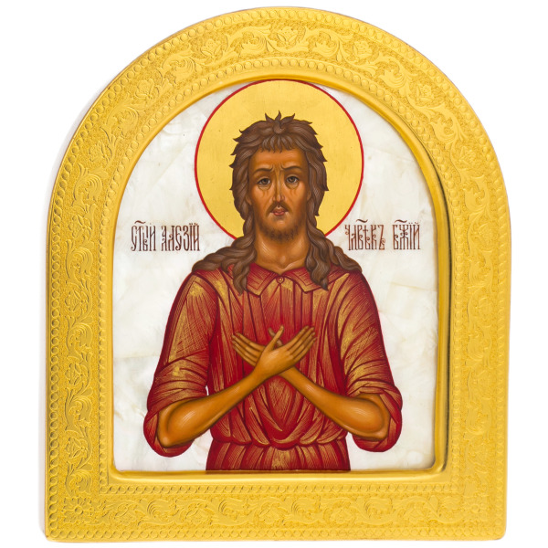 Икона, созданная на тончайших пластинах натурального перламутра и заключённая в объемную золочёную раму, являет собой произведение духовного и декоративного искусства, исполненное редкой чистоты и внутреннего достоинства. Мягкое сияние перламутра, на котором прописан образ святого Алексия Человека Божия, даёт особую глубину красочным слоям и подчёркивает тишину и сосредоточенность лика. Тёплый золотой ореол над головой, строгие складки одеяния, смиренный жест рук, скрещённых на груди, раскрывают характер святого, чья жизнь, исполненная служения и молитвы, нашла отражение в строгой и в то же время одухотворённой композиции.
