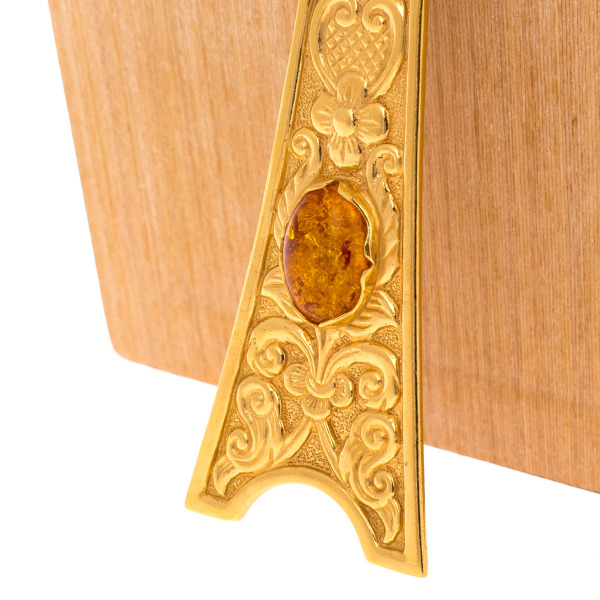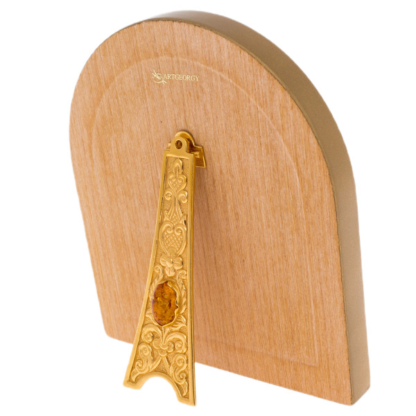 Рама, покрытая насыщенным золотом и украшенная тончайшим рельефом, формирует гармоничный архитектурный обрамляющий контур, выступающий частью художественного замысла. Бархатистая фактура перламутровой основы, соединяясь с благородным тоном золота, создаёт эффект мягкого внутреннего свечения, визуально углубляющего пространство и подчёркивающего рукотворную тонкость живописного письма. На оборотной стороне установлен изящный опорный элемент с золотым покрытием и вставкой из натурального янтаря, что придаёт иконе завершённость и позволяет располагать её в интерьере как настольный объект исключительной выразительности.