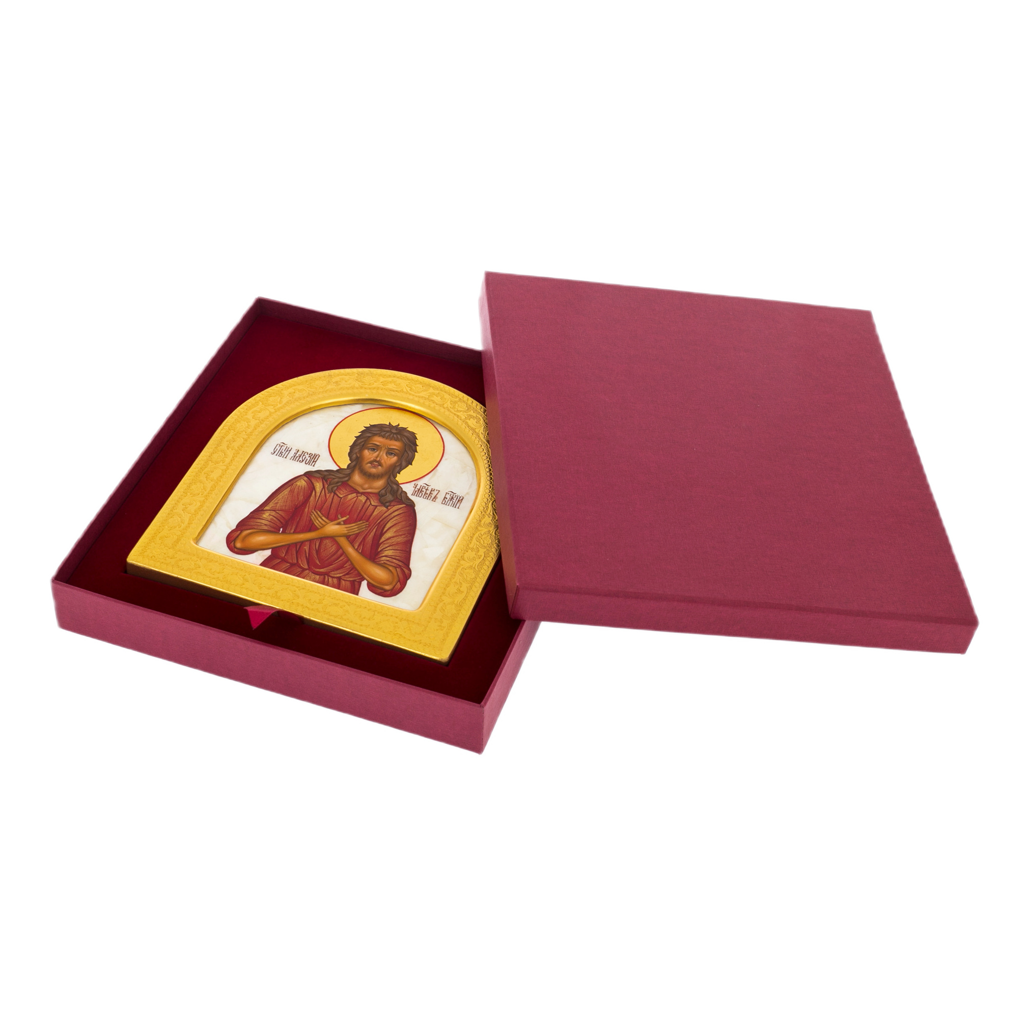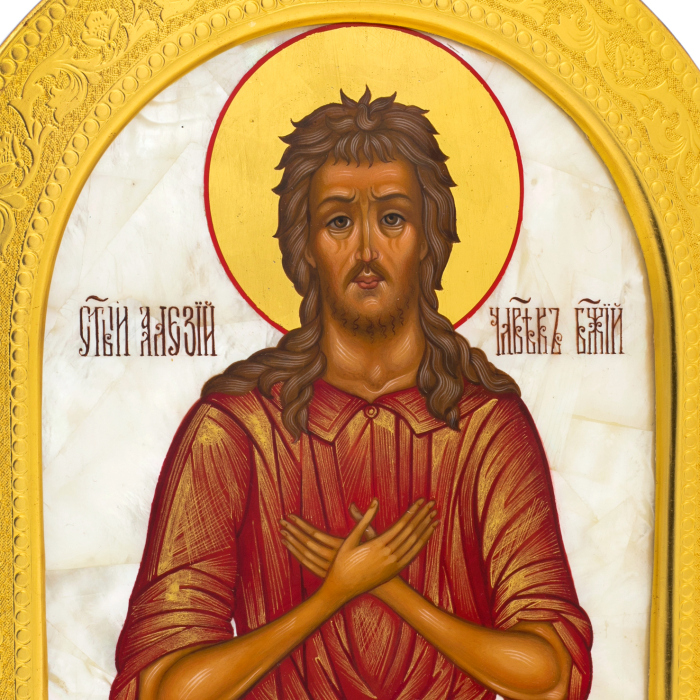 Икона на натуральном перламутре "Алексий Человек Божий" в золотой раме