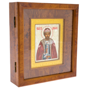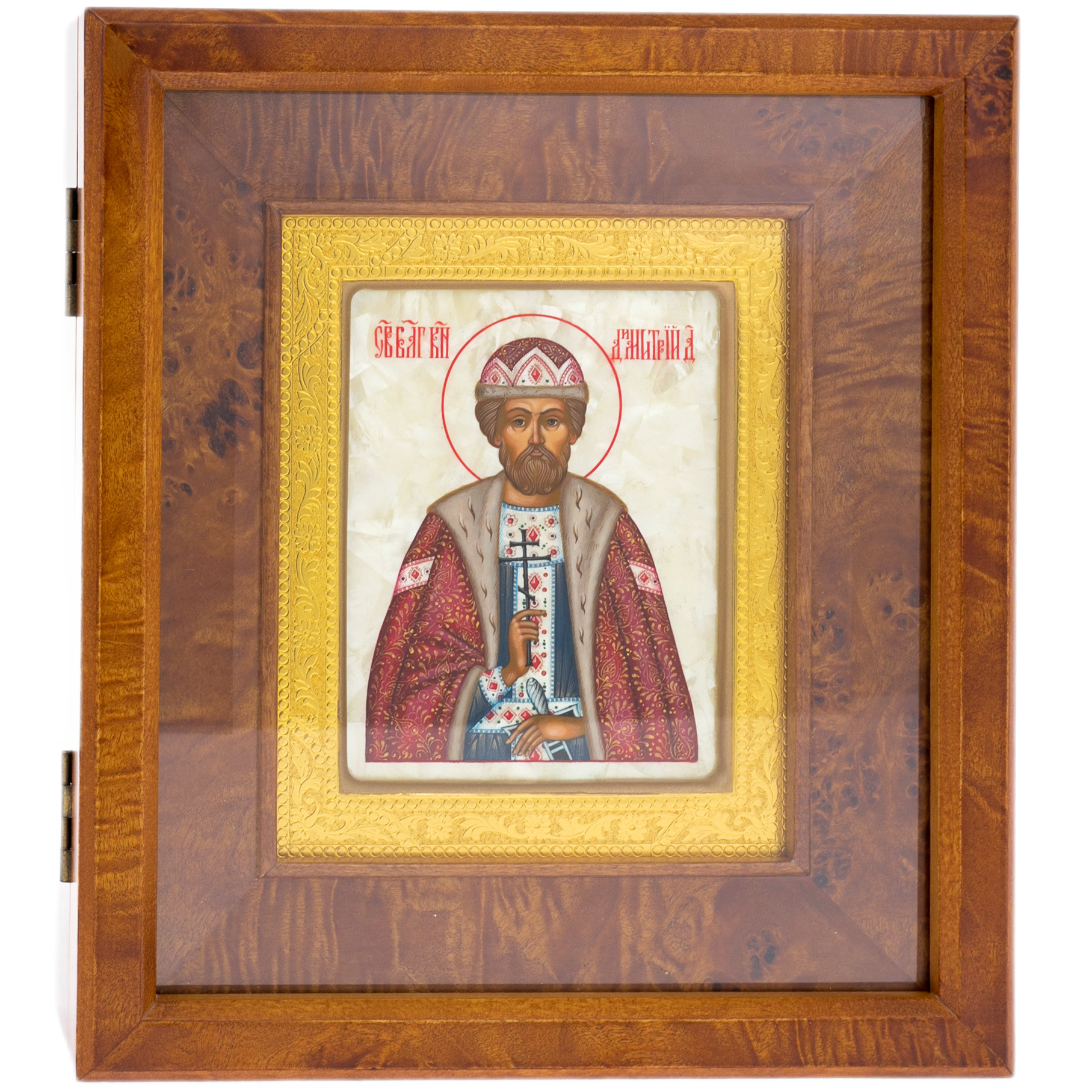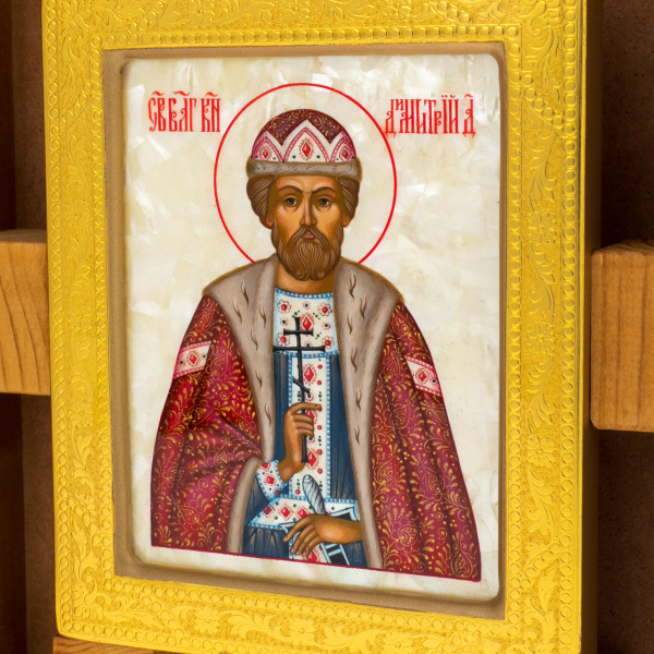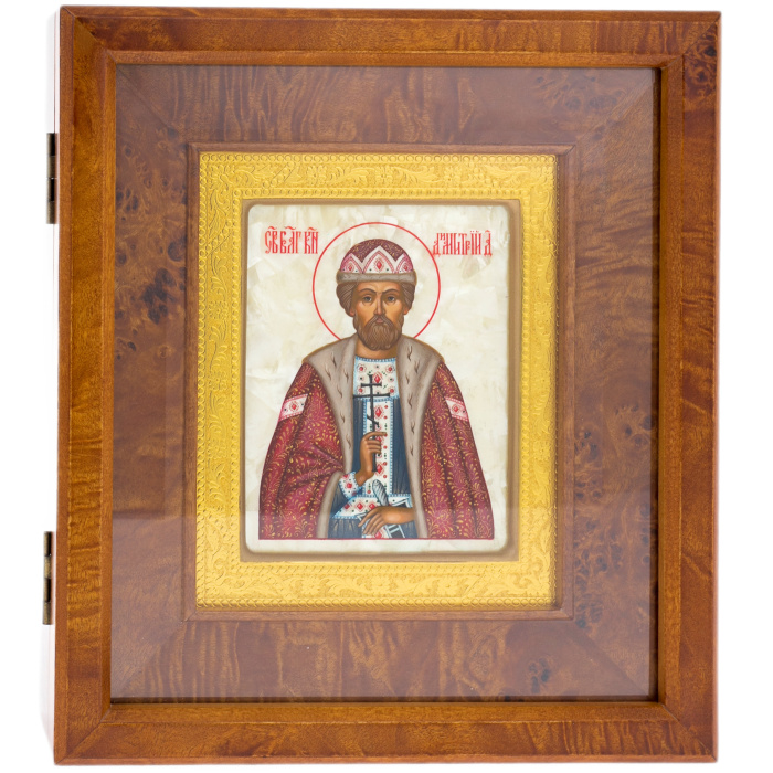 Икона на натуральном перламутре "Дмитрий Донской" в золотой раме и киоте