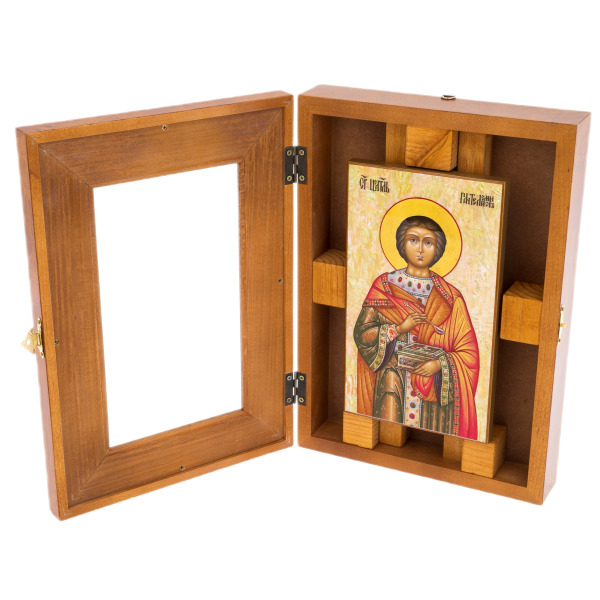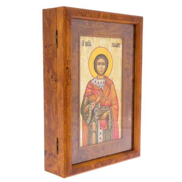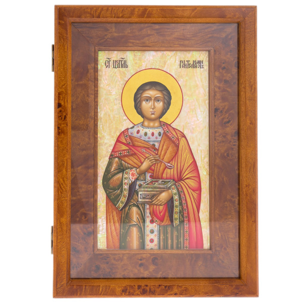 Икона на натуральном перламутре "Пантелеймон Целитель" в киоте