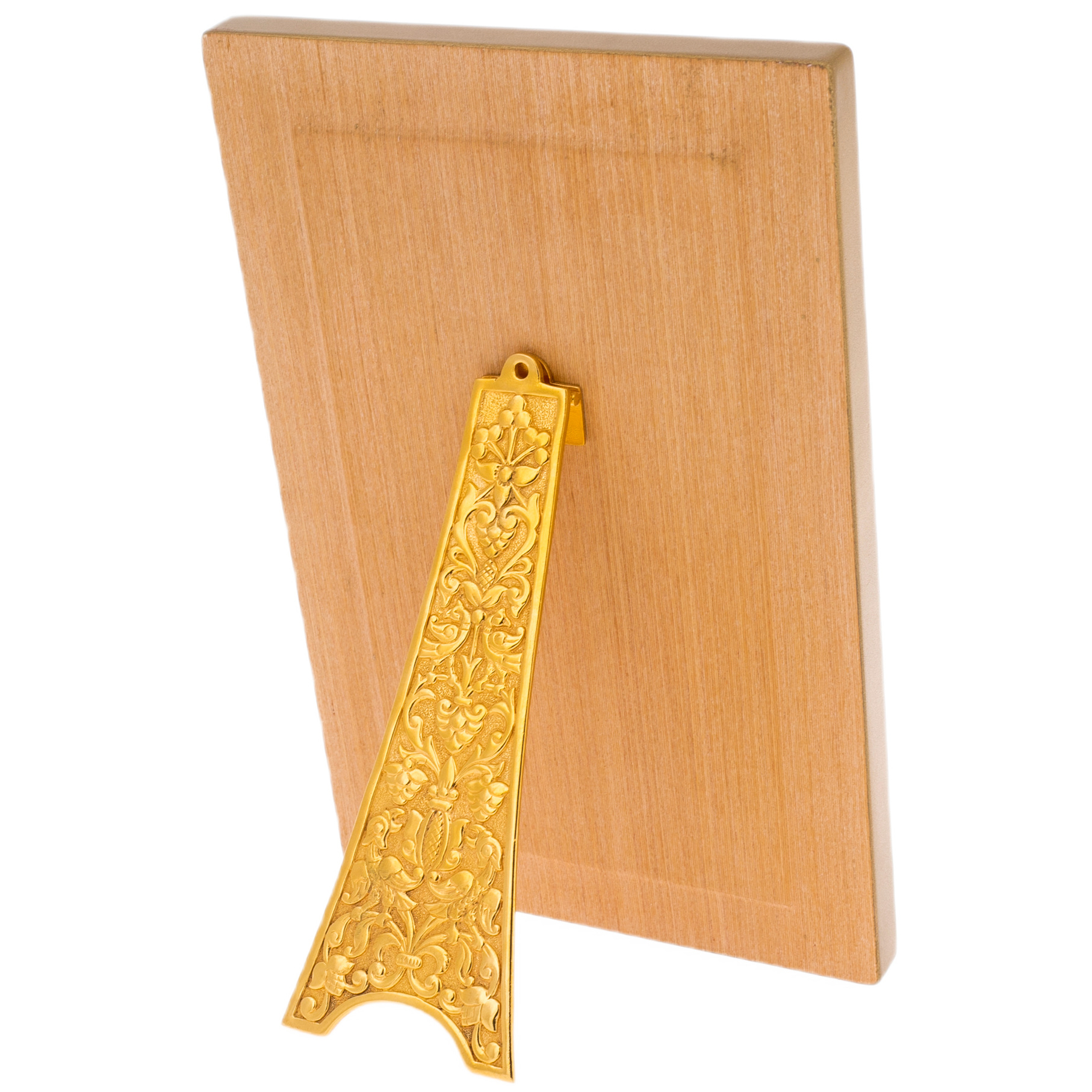 Задняя часть иконы выполнена из натурального дерева, что подчёркивает её статус и основательность. Роскошная подставка, украшенная сложной резьбой, создаёт ощущение цельности композиции. Этот предмет не просто украшение дома или рабочего кабинета, но знак внутренней силы владельца, символ защиты и благословения. Икона способна не только украсить пространство, но и стать тем духовным камертоном, который гармонизирует энергию и наполняет каждый день смыслом.
