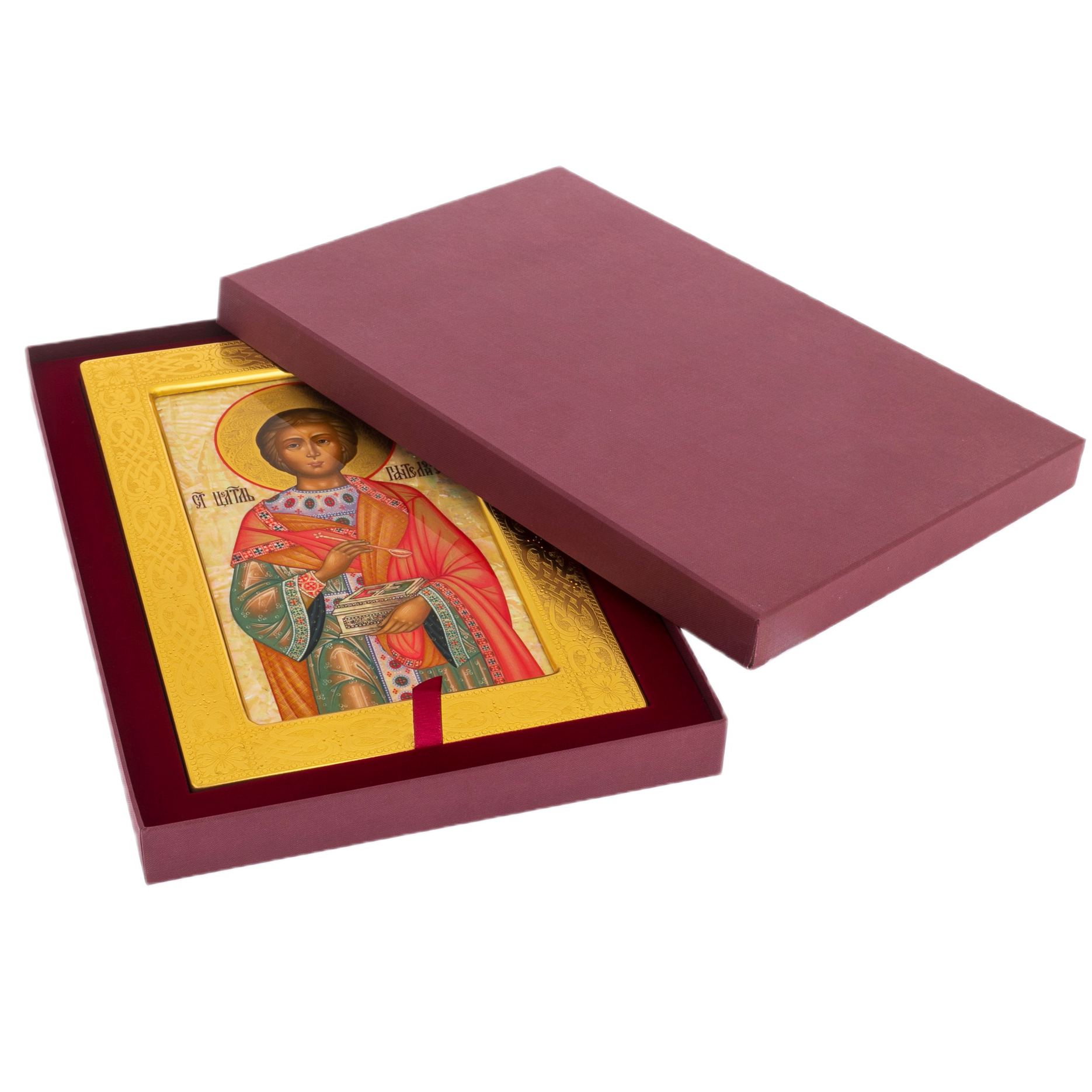 Взгляд Пантелеймона строг, но исполнен милосердия. Его правая рука с тонкими, аристократическими пальцами удерживает ложечку – символ врачебного искусства и дара исцеления, а в левой – шкатулка с целебными снадобьями, будто сосуд, хранящий древнюю мудрость. Каждая деталь — от тончайшего рисунка на одеянии до легчайших теней, придающих объем, — свидетельство высочайшего уровня мастерства и преданности традиции.