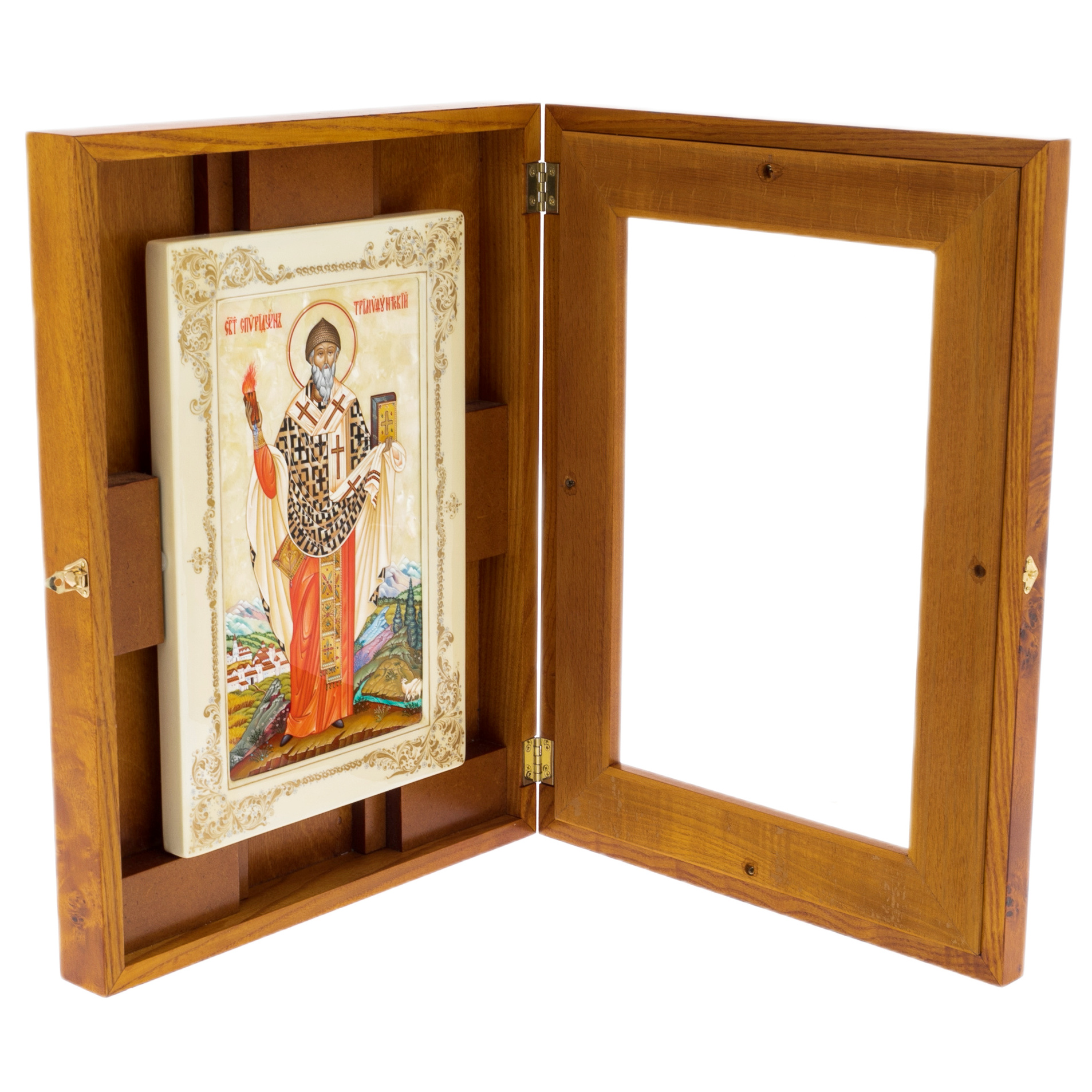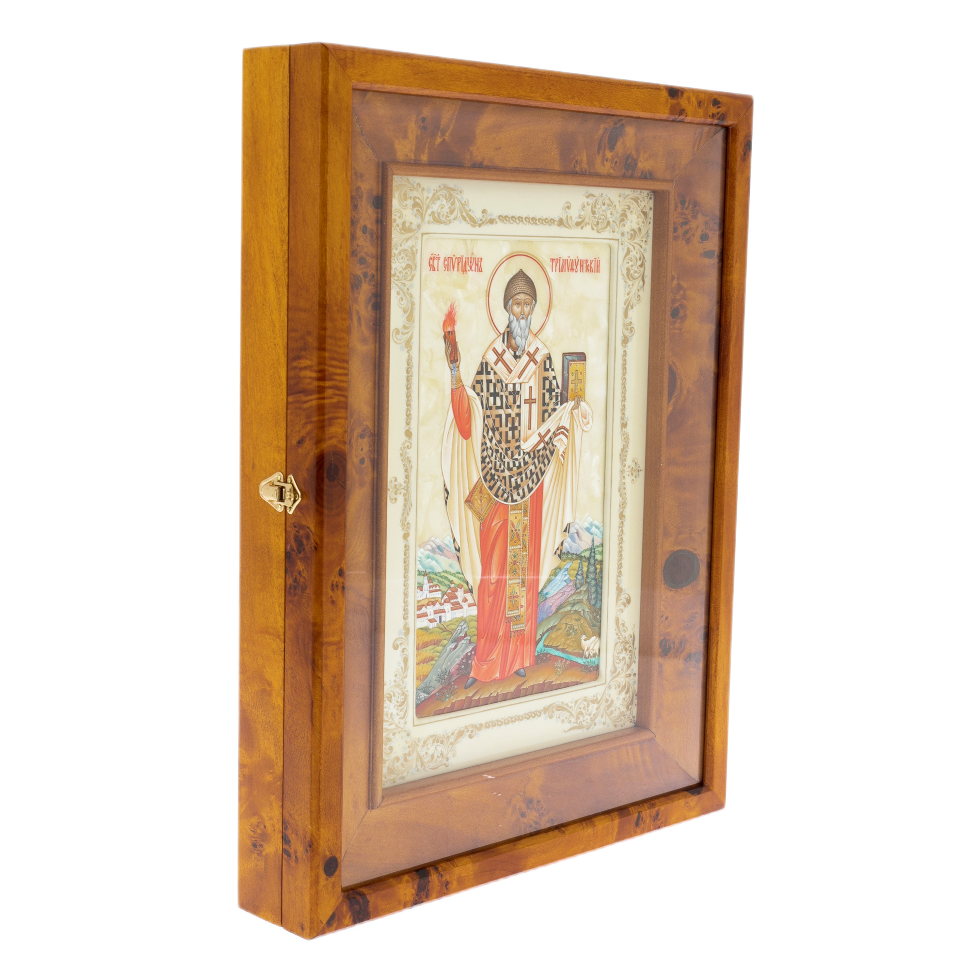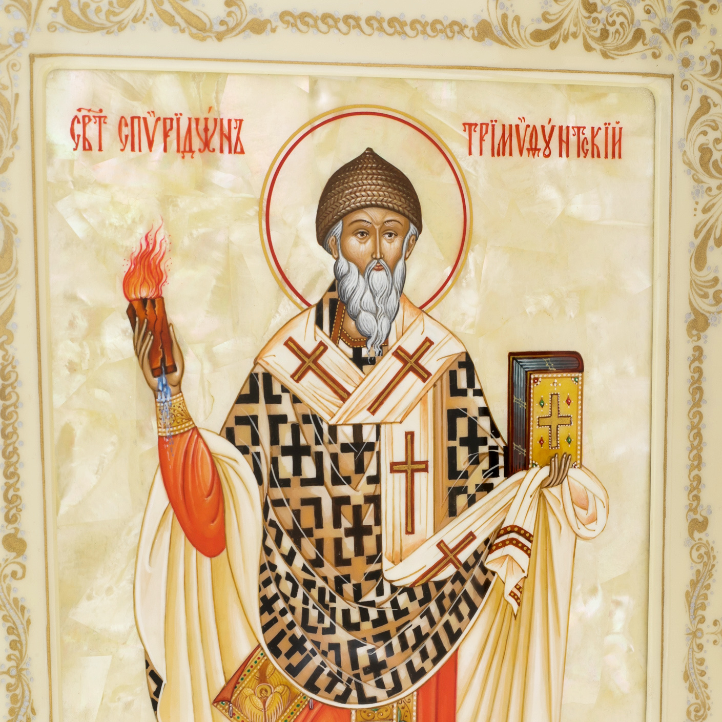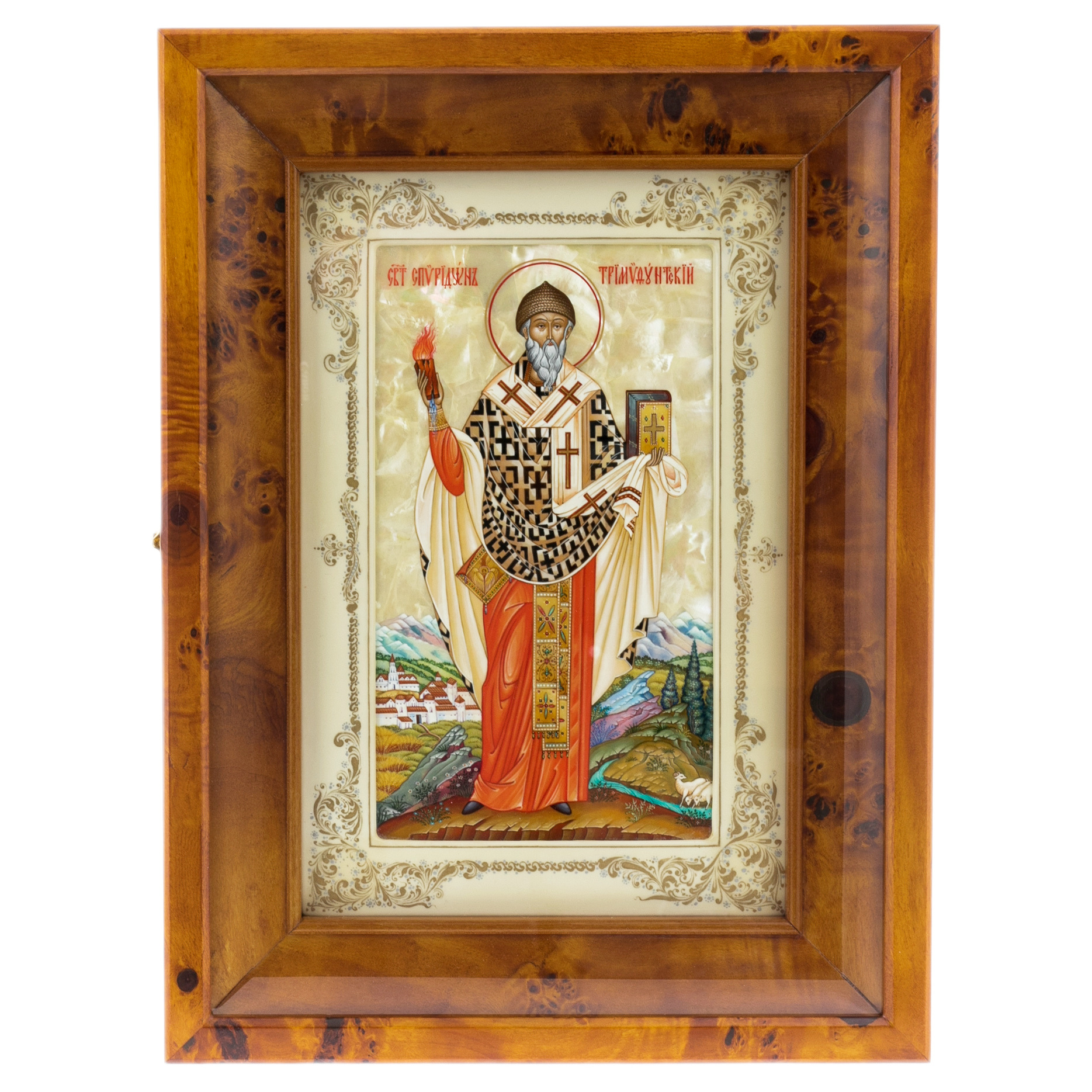 Икона на натуральном перламутре "Спиридон Тримифунтский" в киоте и белой раме