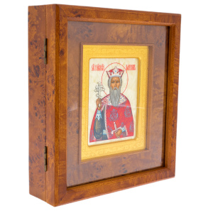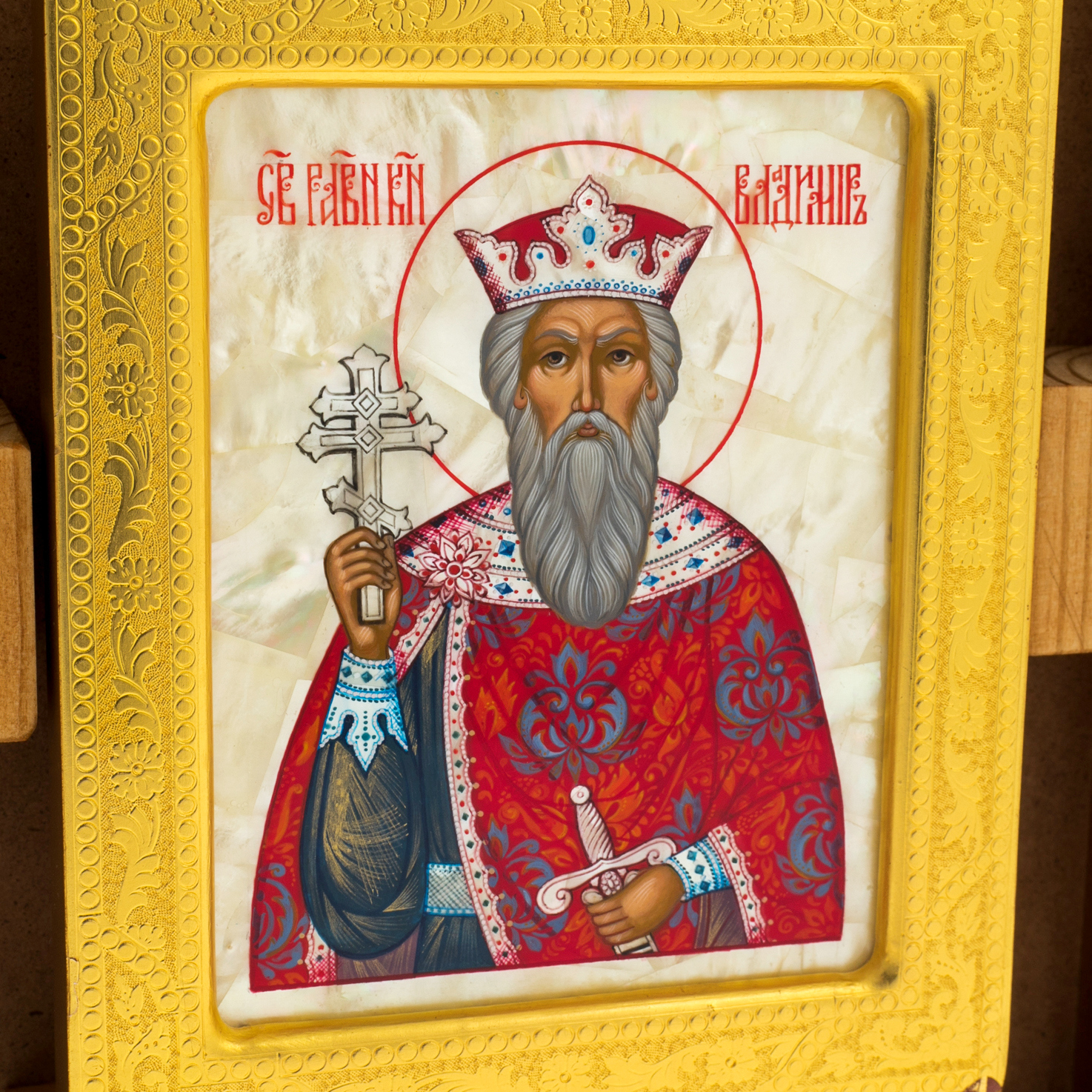 Икона на натуральном перламутре "Святой князь Владимир" в золотой раме и киоте