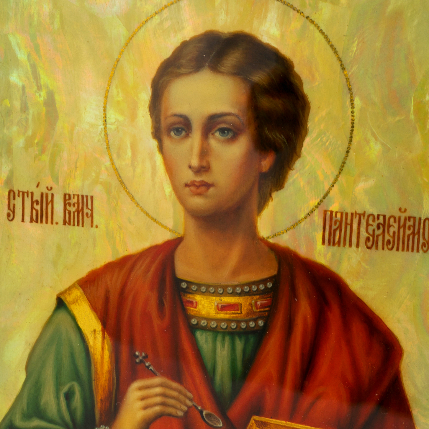 В сиянии благородного перламутра лик Святого Пантелеймона является образом небесного покровительства, воплощенного в безмолвной строгости иконописной традиции. Каждая черта его лика передает неизменное спокойствие, мудрость и силу всепрощающей любви. В руках целителя – символы его дара: золотая шкатулка с целебными снадобьями и тонкий инструмент, предназначенный для исцеления недугов не только телесных, но и душевных. Глубокий взгляд, словно проникающий сквозь века, пробуждает чувство умиротворения и доверия, приглашая к тихому внутреннему диалогу.