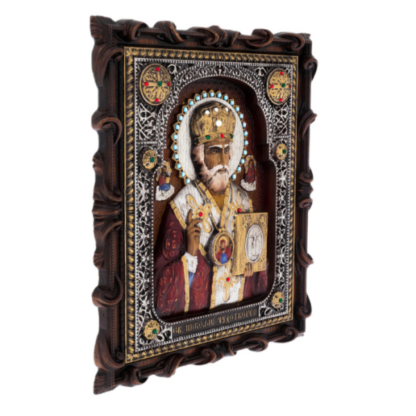 Рама, выполненная в сложной резьбовой манере, превращает икону в поистине царский дар. Узорчатые мотивы, перекликающиеся с древними храмовыми орнаментами, обрамляют образ святого, словно охраняя его от мирской суеты. Вкрапления янтаря в раме создают эффект мерцающего света, подобного пламени лампады, что непрерывно горит в глубинах монастырских стен.