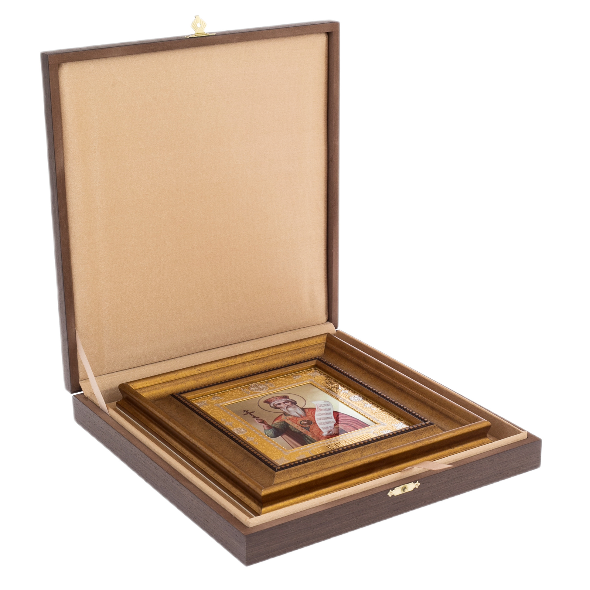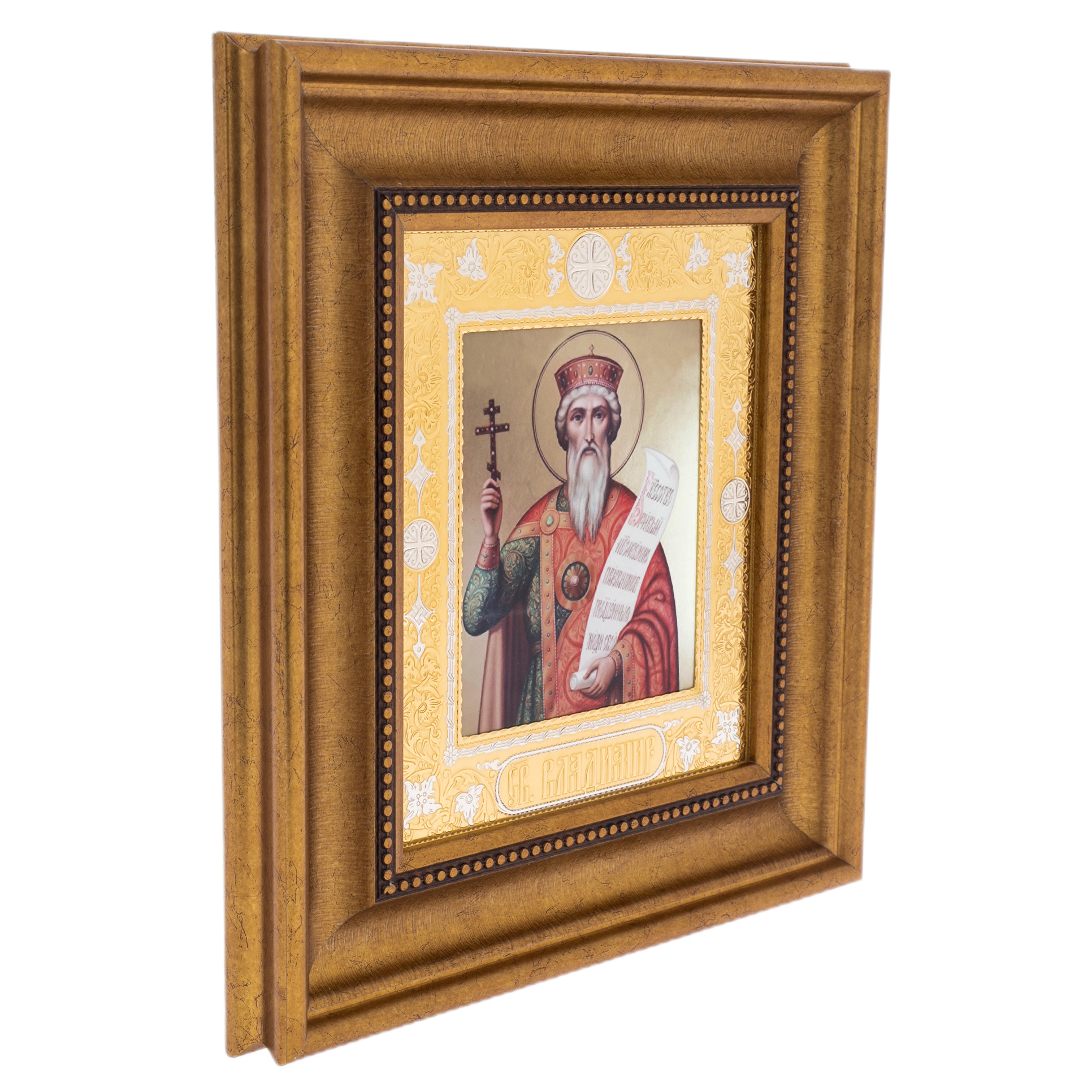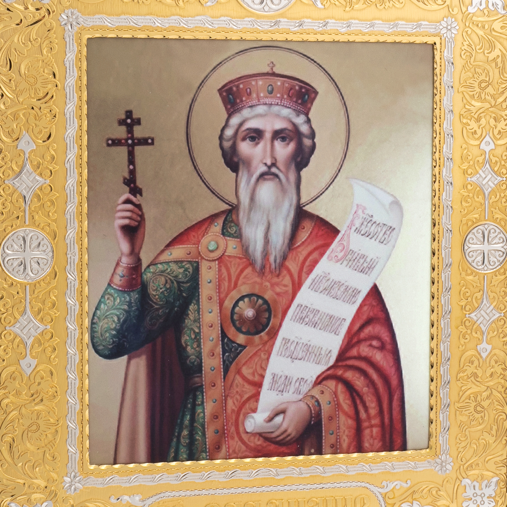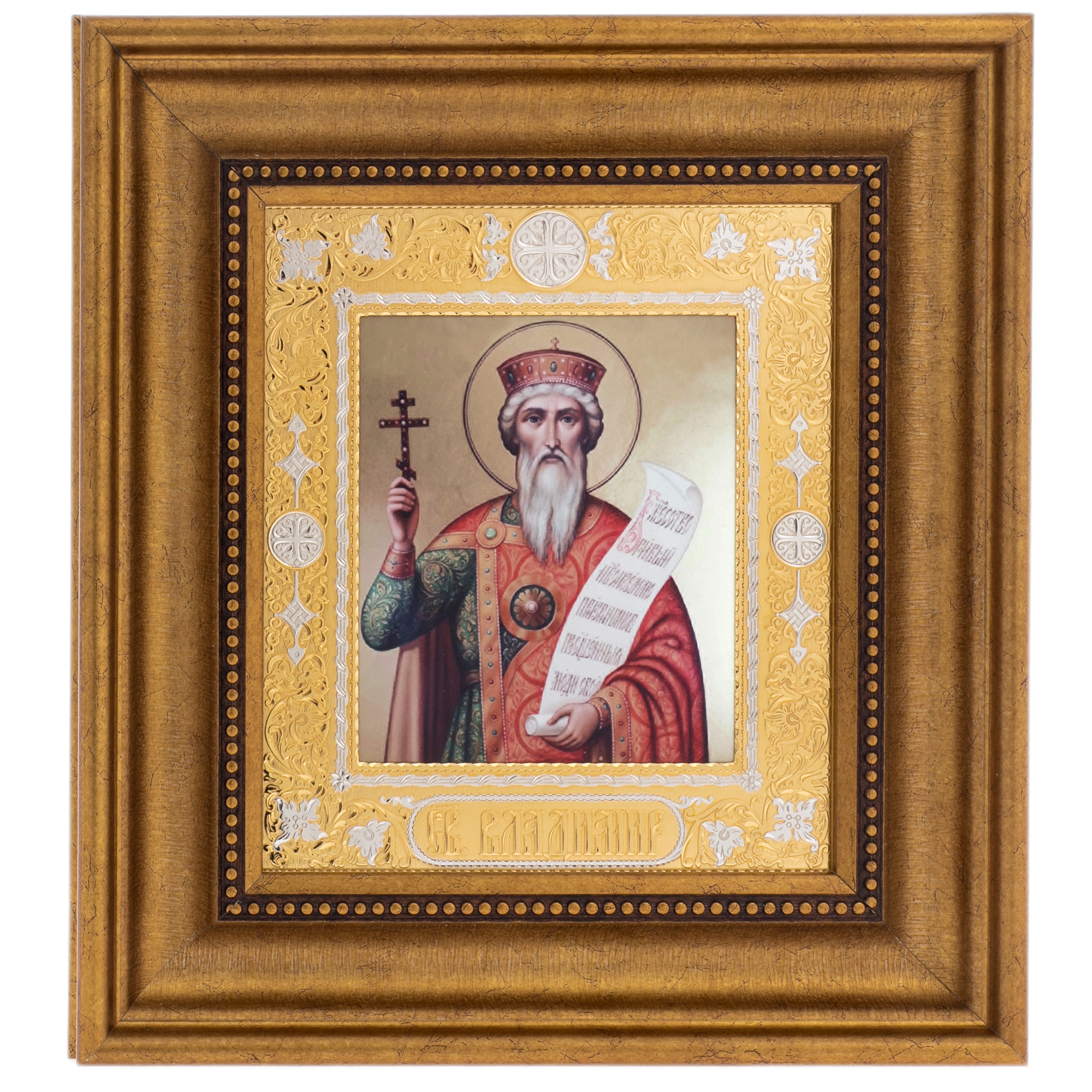 Икона "Святой равноапостольный князь Владимир" в подарочном исполнении выполнена на основе классических православных традиций с использованием златоустовской техники. Образ князя Владимира, облачённого в царские одежды и державшего крест, исполнен с глубокой духовной выразительностью и тонкой детализацией. Рама из благородного дерева с изысканным золотым и серебряным тиснением обрамляет икону, придавая ей торжественность и особый статус. Эта икона адресована тем, кто чтит память великого князя и стремится наполнить дом духовной силой и благодатью.