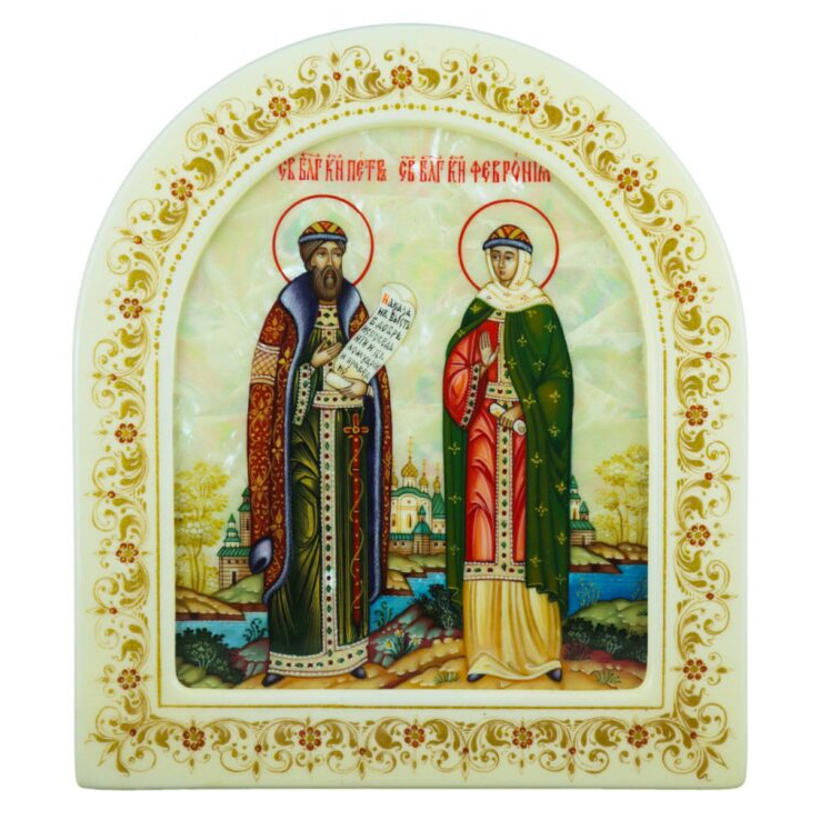 Икона с перламутром "Пётр и Феврония" в белой раме (арка)