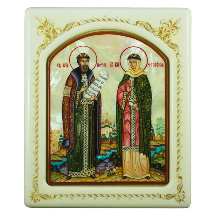 Икона с перламутром "Пётр и Феврония" в белой раме с орнаментом