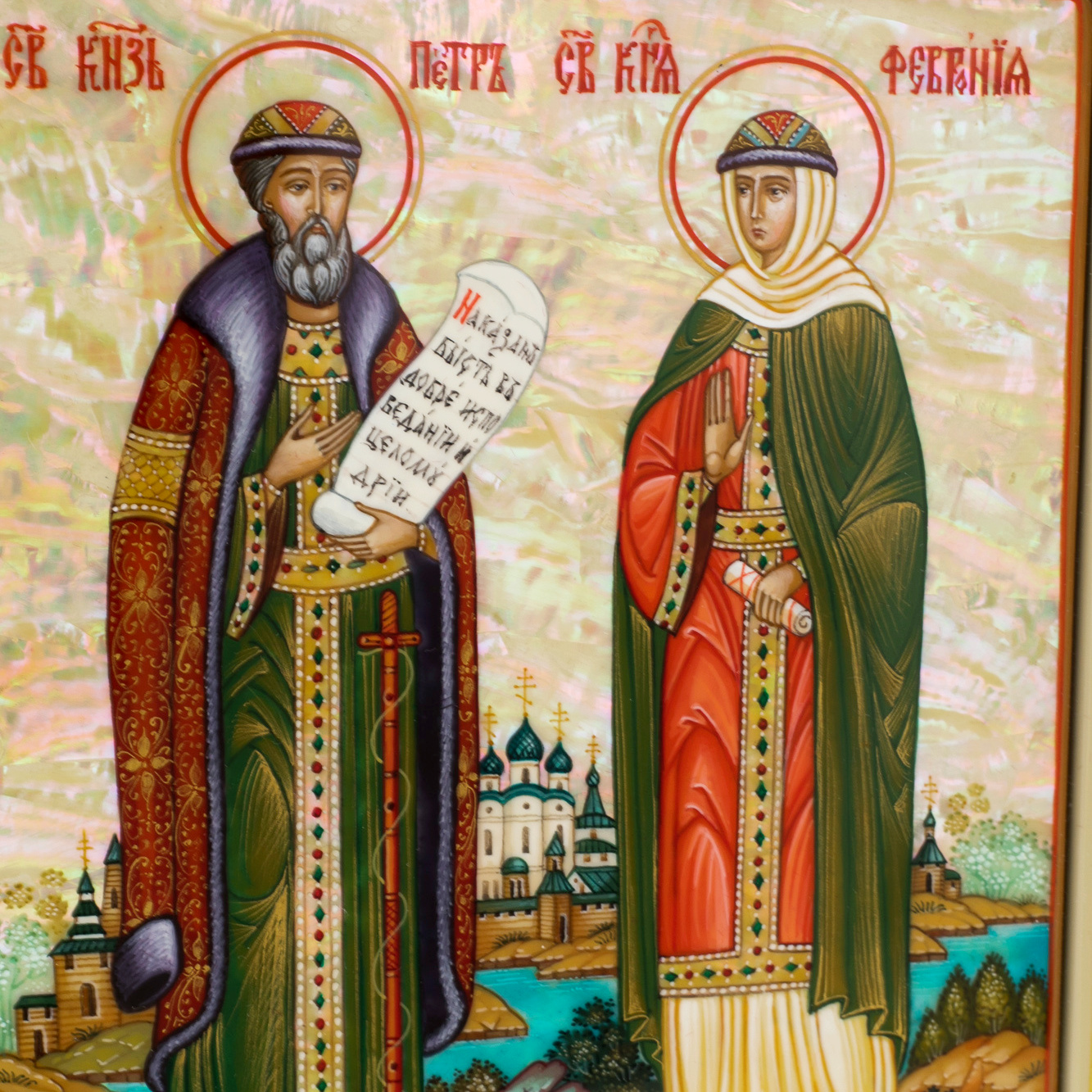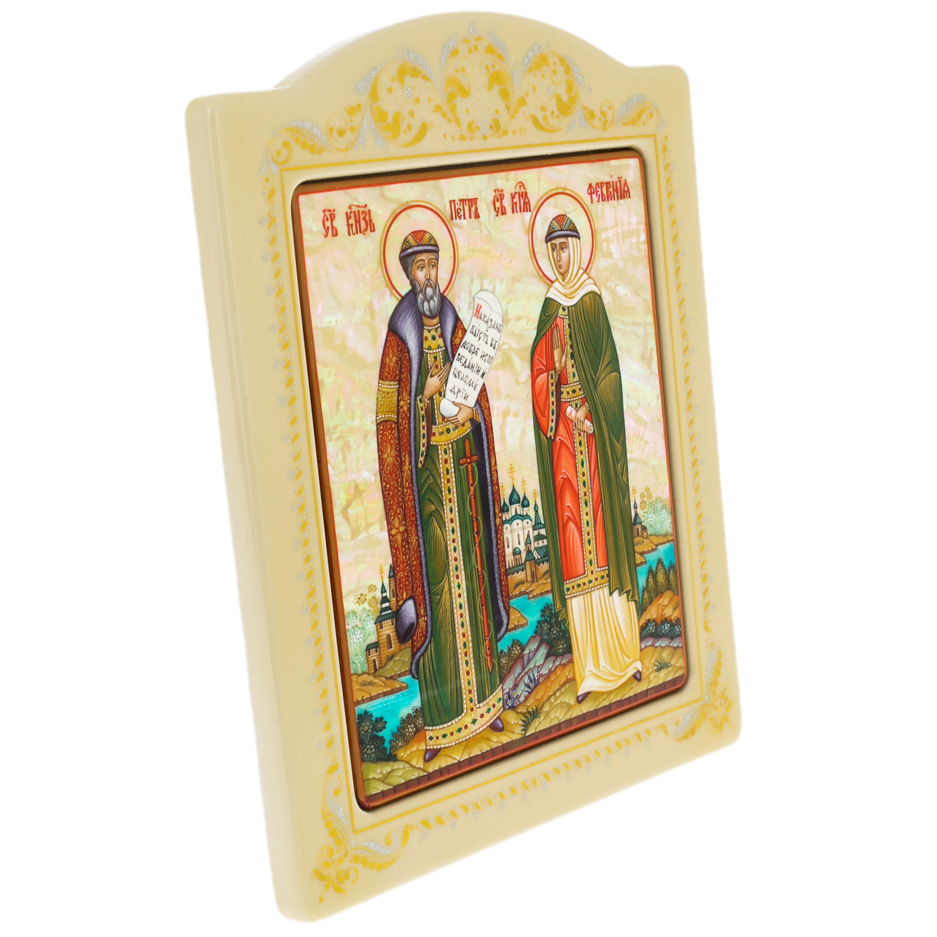 Икона с перламутром "Пётр и Феврония" в раме с орнаментом
