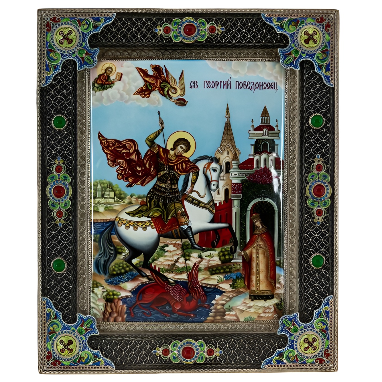 На финифти, яркой и глубокой, словно само небо, изображён святой воин на белом коне, сражающийся с драконом, который извивается у его копыт. Лик Георгия спокоен и сосредоточен, в нём нет места страху — лишь абсолютная уверенность и бесстрашная решимость. Его плащ, развевающийся на ветру, напоминает крыло могучего орла, парящего над миром, и символизирует свободу, даруемую победой над злом.