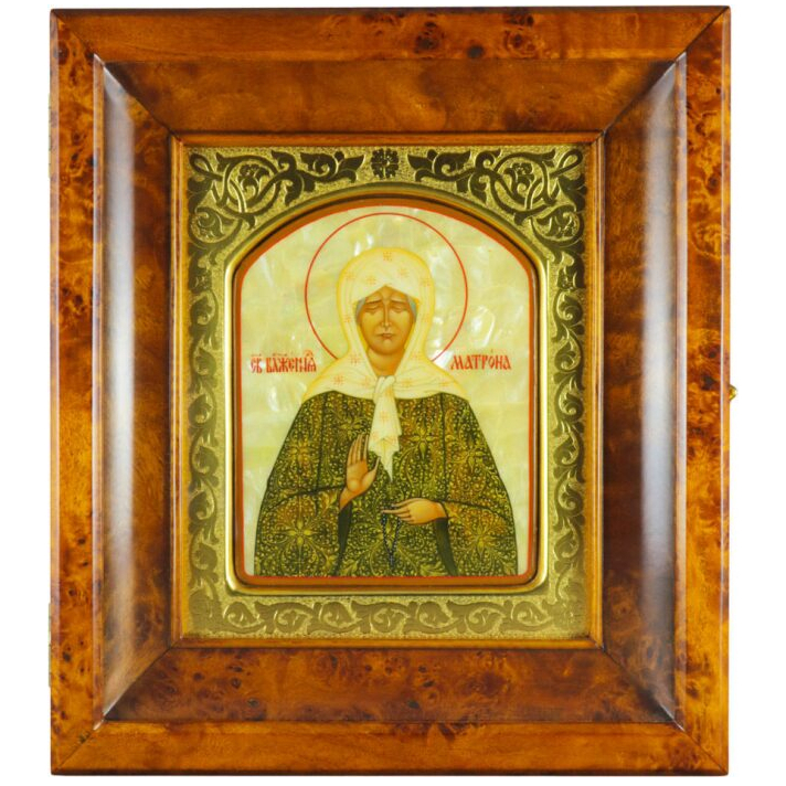 Икона в золотой раме и киоте "Матрона Московская" на натуральном перламутре
