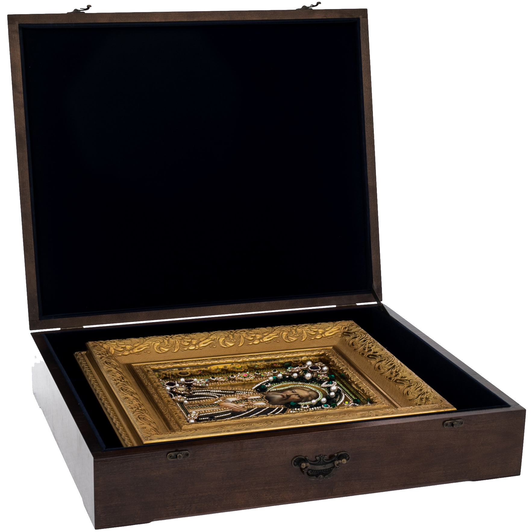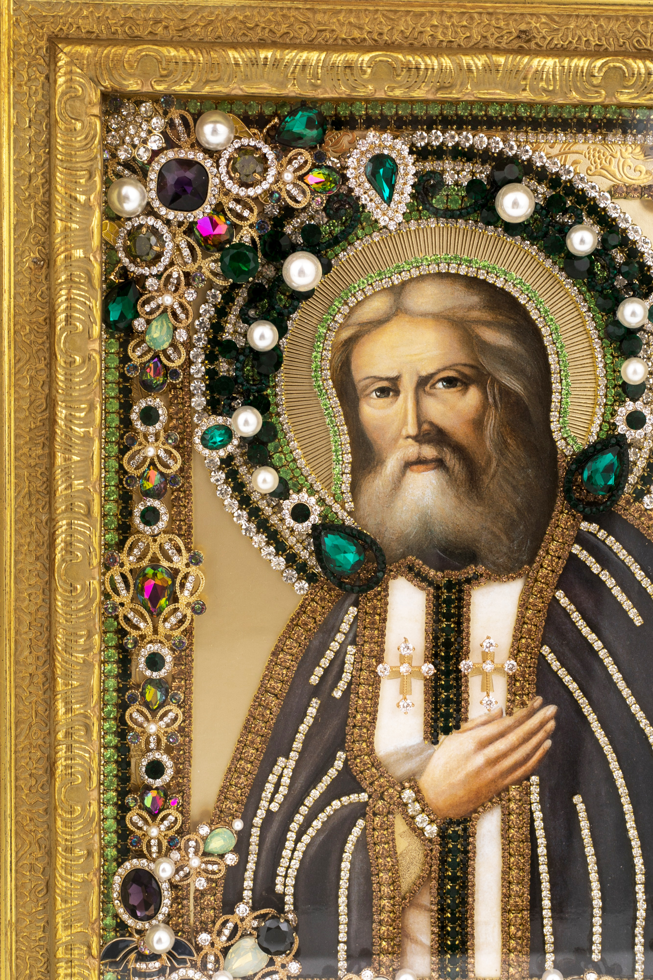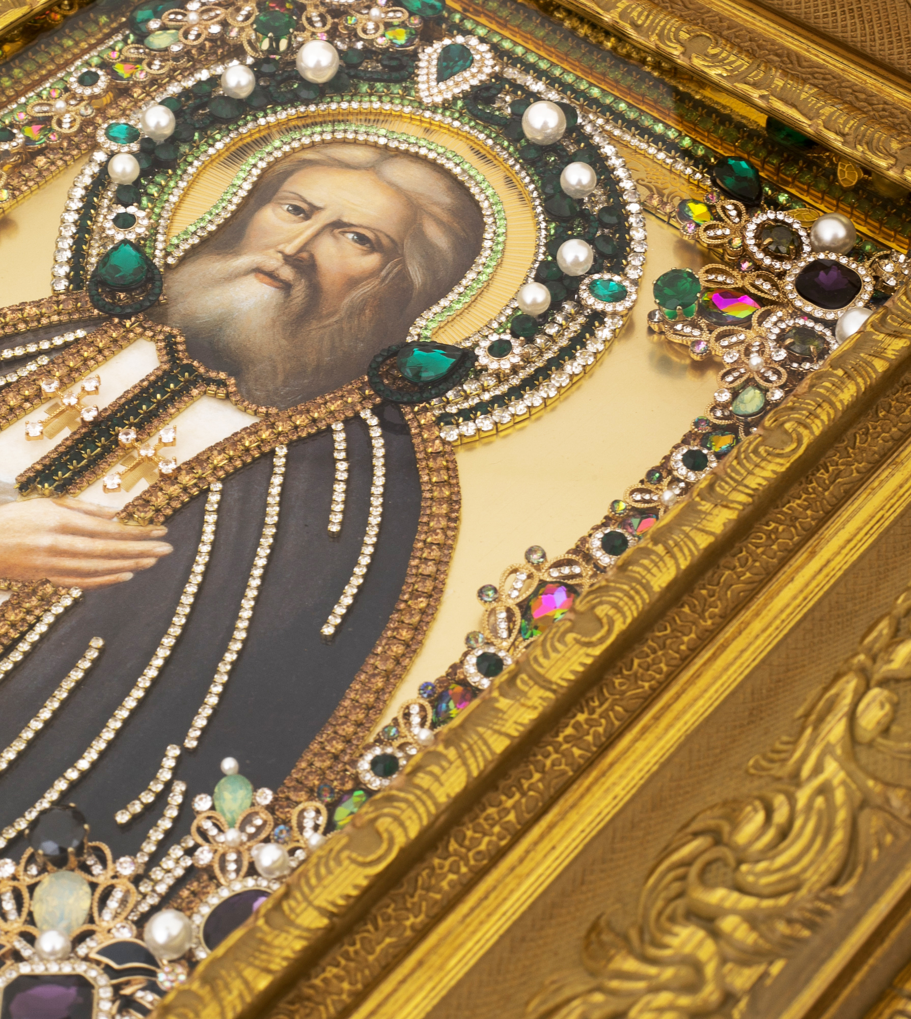 Материалы:липовая доска левкас, масляные краски, сусальное золото, стекло, жемчуг, фианиты, стразы.