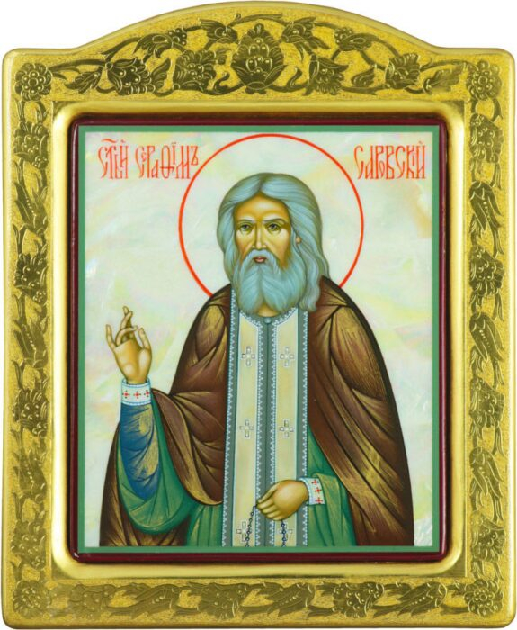 Икона "Серафим Саровский" с перламутром в золотой раме