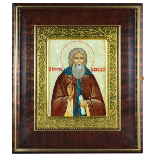 Икона "Сергий Радонежский" в киоте и золотой раме на натуральном перламутре
