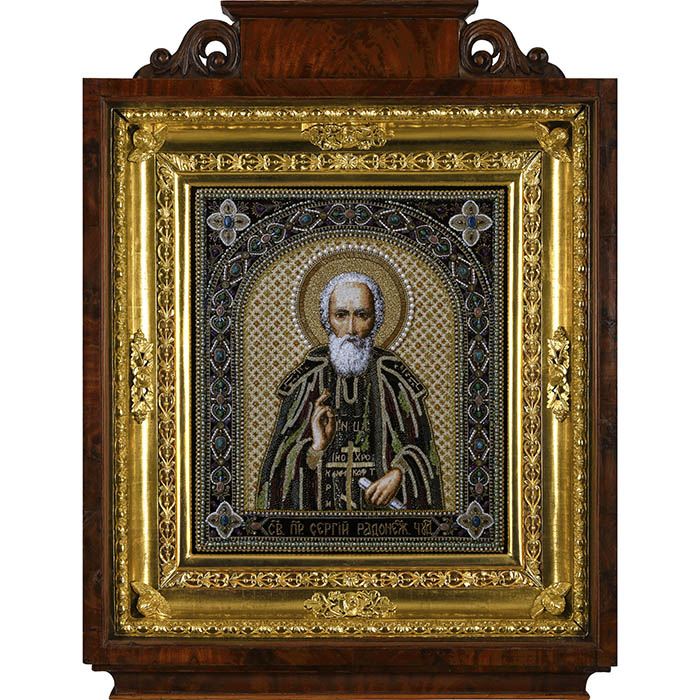 Вышитая икона "Святой Преподобный Сергий Радонежский" в раме и киоте