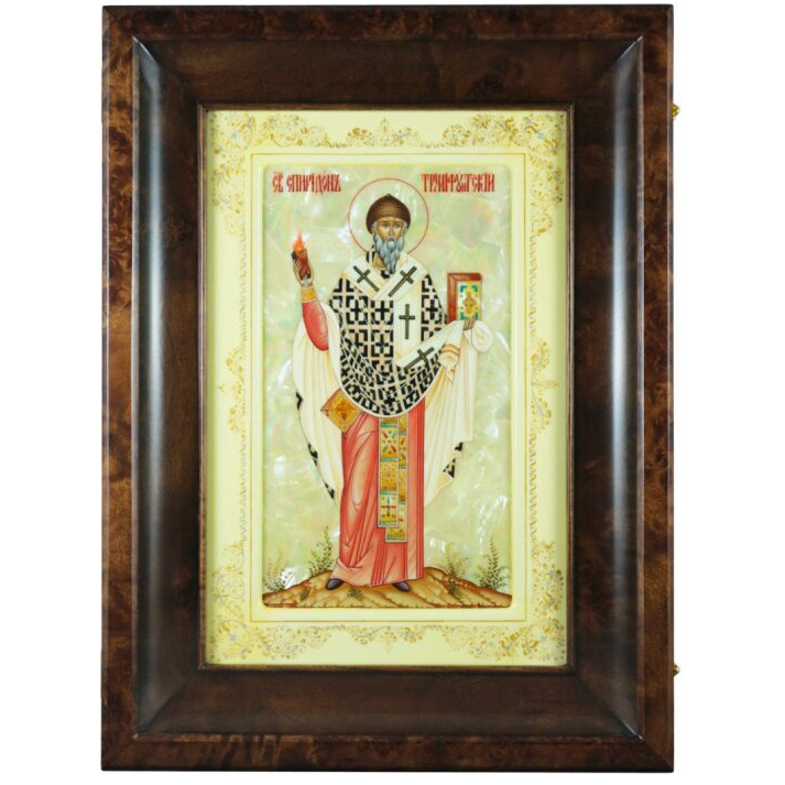 Икона "Спиридон Тримифунтский" на натуральном перламутре в киоте и белой раме