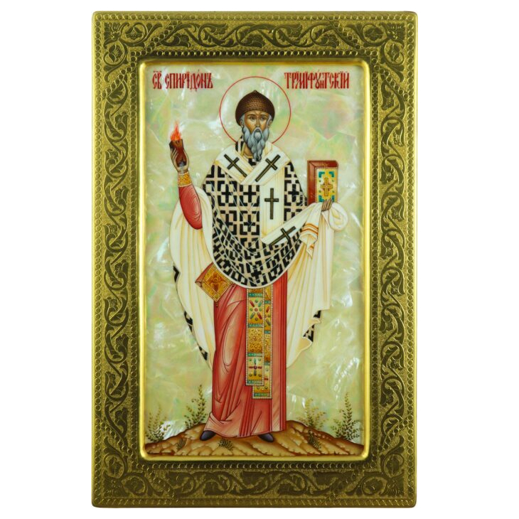 Икона "Спиридон Тримифунтский" в золотой раме на натуральном перламутре