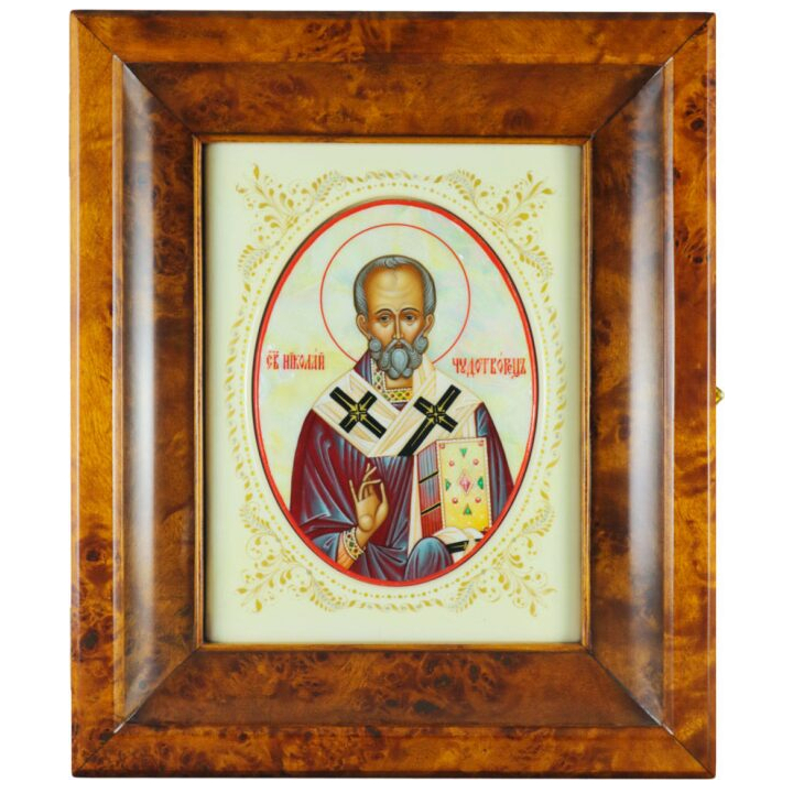 Икона на натуральном перламутре "Николай Чудотворец" в белой раме и киоте