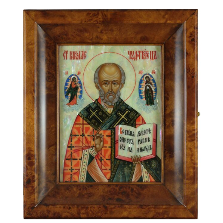 Икона на натуральном перламутре "Николай Чудотворец" в киоте