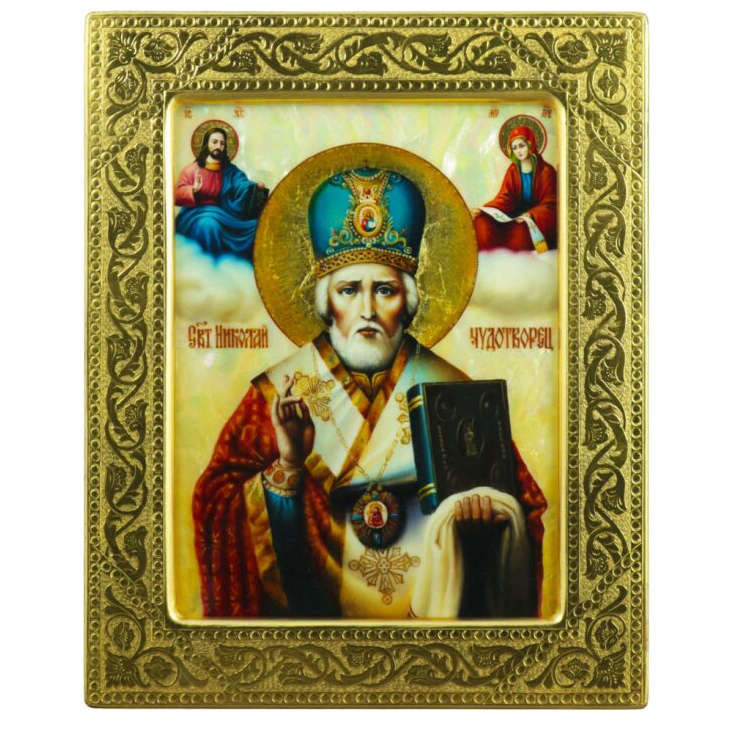 Икона "Николай Чудотворец" на натуральном перламутре в золотой раме