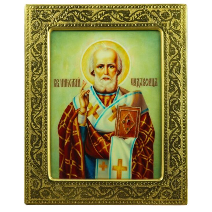 Икона "Николай Чудотворец" на натуральном перламутре в золотой раме