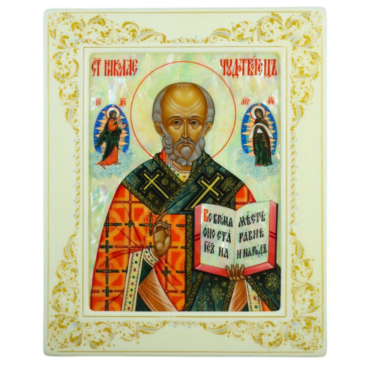 Икона на перламутре "Николай Чудотворец" в белой раме