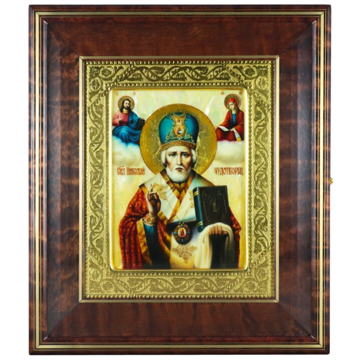 Икона "Николай Чудотворец" в киоте и золотой раме на натуральном перламутре