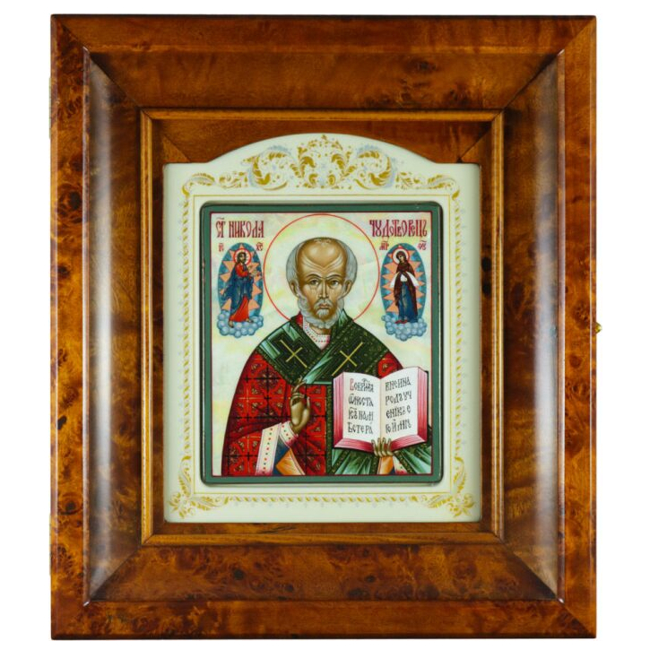 Икона "Святитель Николай" с навершием, финифть Икона "Святитель Николай" с навершием, финифть Финифть – древнейшее искусство миниатюрной живописи. Процесс изготовления невероятно сложен. Над созданием каждого изделия трудятся лучшие мастера-живописцы. Роспись по эмали практически вечно сохраняет чистоту, блеск и прозрачность цвета. Изделия ростовской финифти признаны ценителями искусства всего мира. Они хранятся в таких музеях, как Музей народного искусства в Москве, Государственный Исторический музей, Государственный Русский музей. В нашем магазине Вам представляется уникальная возможность приобрести шедевр класса Deluxe.