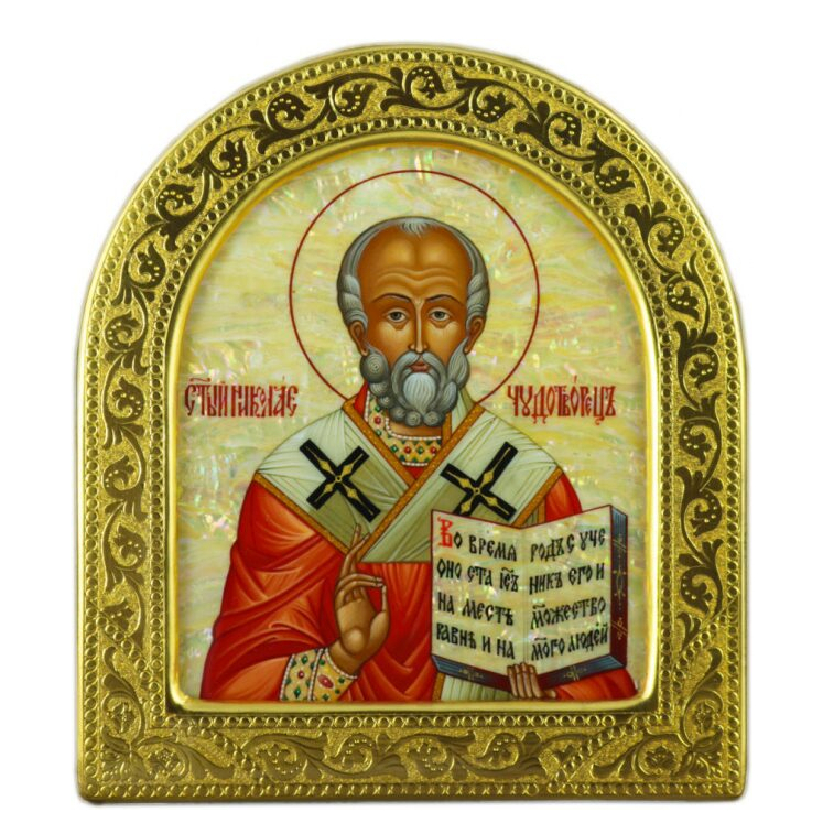 Икона с перламутром "Николай Чудотворец" в золотой раме (арка)
