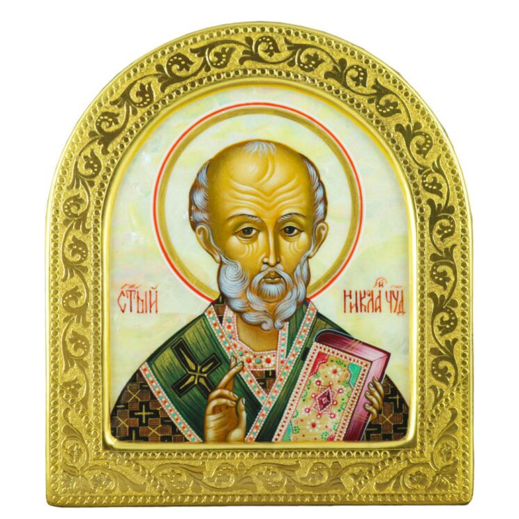 Икона с перламутром "Николай Чудотворец" в золотой раме (арка)